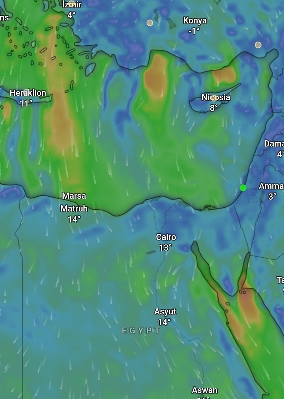 نشاط رياح: على مناطق من السواحل الغربية وجنوب سيناء وجنوب البلاد مما يزيد من الإحساس بانخفاض درجات الحرارة.