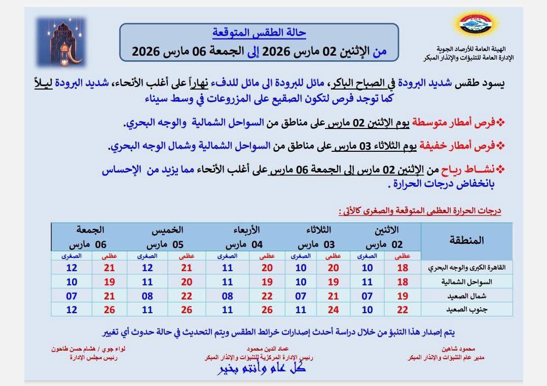 وفيما يلي بيان بدرجات الحرارة العظمى والصغرى المتوقعة خلال الفترة من الإثنين 2 مارس حتى الجمعة 6 مارس: