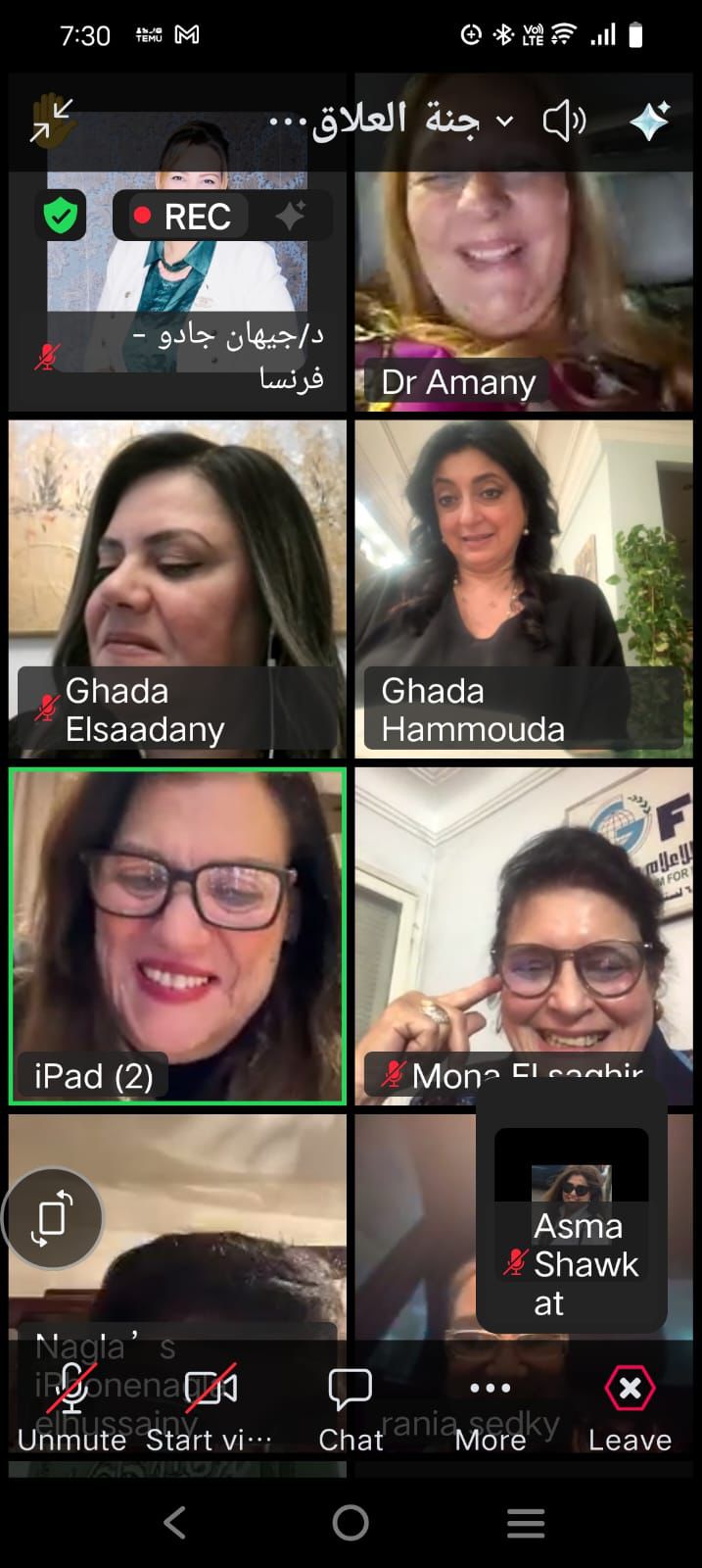 عقدت لجنة العلاقات الخارجية بالمجلس القومي للمرأة اجتماعها الدورى برئاسة السفيرة وفاء بسيم، عضوة المجلس ومقررة اللجنة، وبمشاركة عدد من عضوات وأعضاء اللجنة ، وذلك عبر تقنية «الفيديو كونفرانس ».