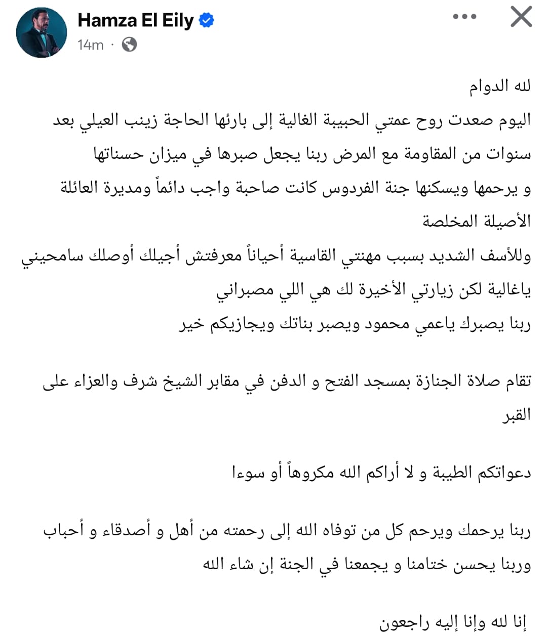 وكتب حمزة العيلي من خلال حسابه الرسمي عبر موقع التواصل الاجتماعي فيسبوك: لله الدوام.. اليوم صعدت روح عمتي الحبيبة الغالية إلى بارئها الحاجة زينب العيلي بعد سنوات من المقاومة مع المرض ربنا يجعل صبرها في ميزان حسناتها