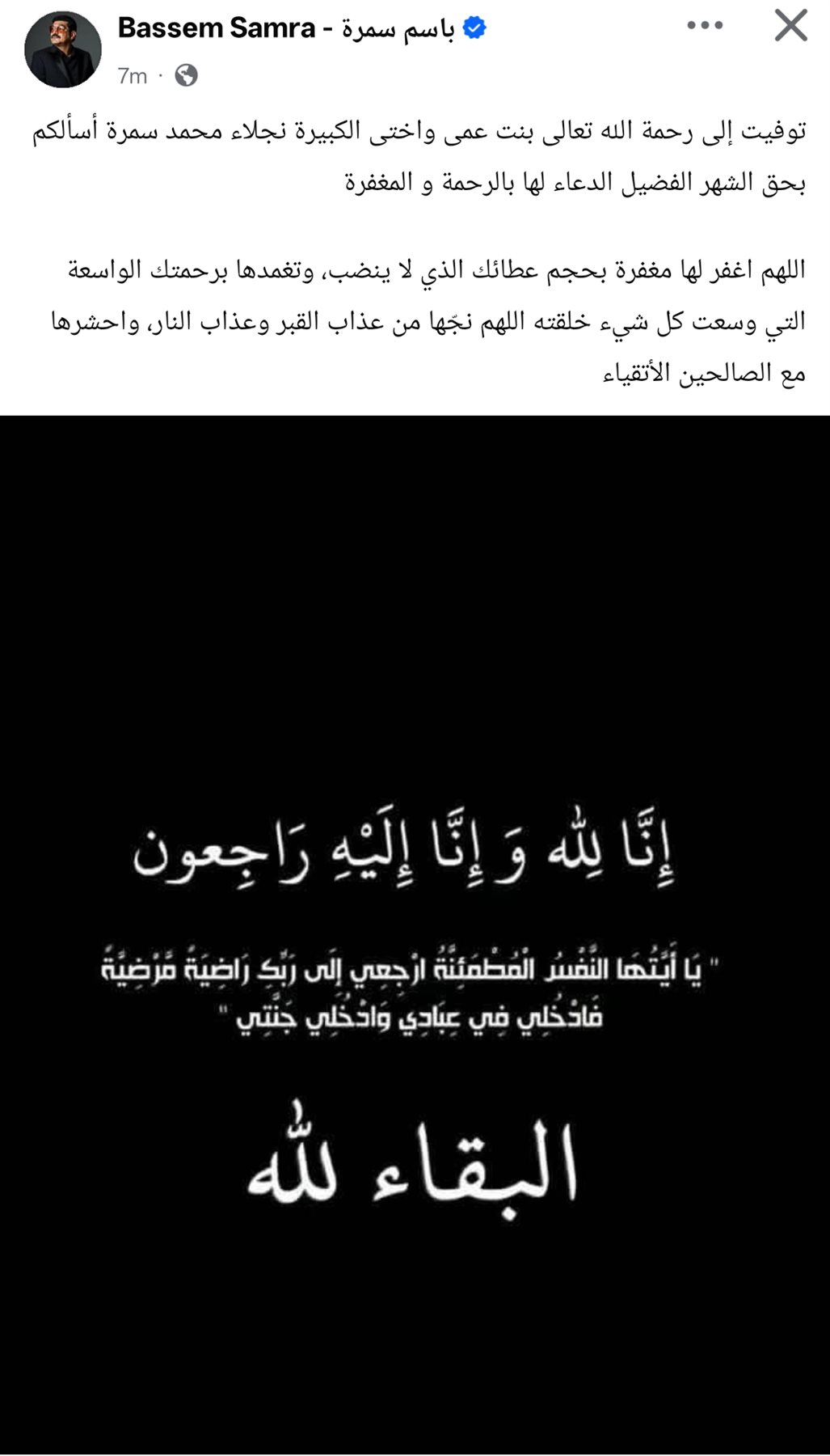 وكتب من خلال حسابه الرسمي عبر موقع التواصل الاجتماعي فيسبوك، قال: توفيت إلى رحمة الله تعالى بنت عمى وأختى الكبيرة نجلاء محمد سمرة أسألكم بحق الشهر الفضيل الدعاء لها بالرحمة و المغفرة.