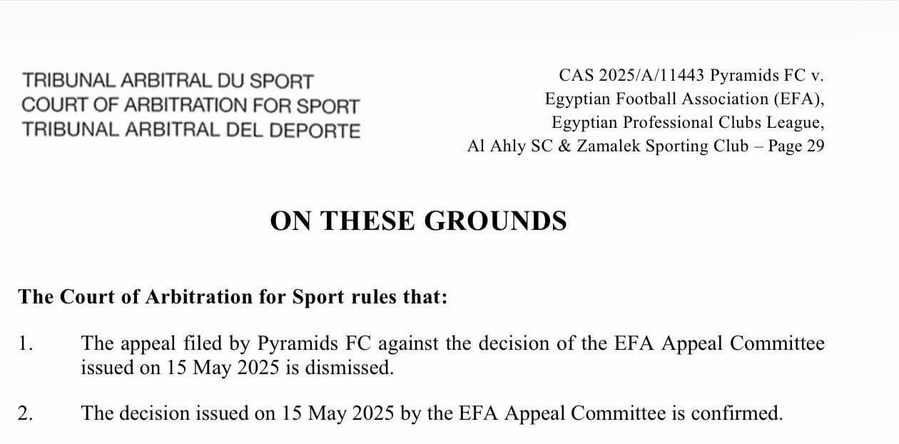 أصدرت المحكمة الرياضية الدولية، اليوم الثلاثاء، حكمها النهائي في النزاع المقدم من نادي بيراميدز بشأن أحقية التتويج بلقب الدوري المصري الممتاز لموسم 2024-2025، لتنهي الجدل الدائر حول هوية البطل.