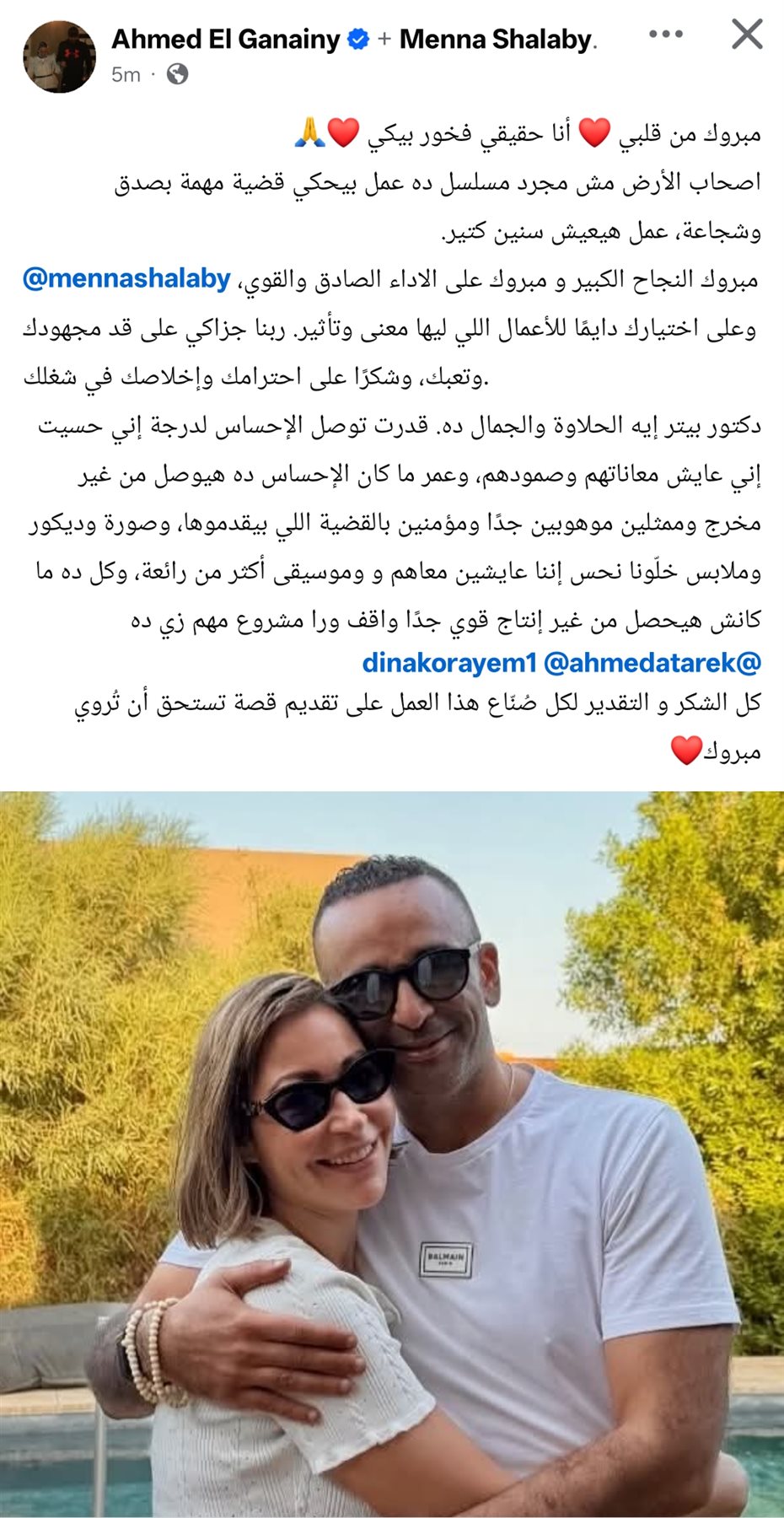 وكتب أحمد الجنايني من خلال حسابه الرسمي عبر موقع التواصل الاجتماعي فيسبوك، قال: مبروك من قلبي، أنا حقيقي فخور بيكي.. اصحاب الأرض مش مجرد مسلسل ده عمل بيحكي قضية مهمة بصدق وشجاعة، عمل هيعيش سنين كتير.