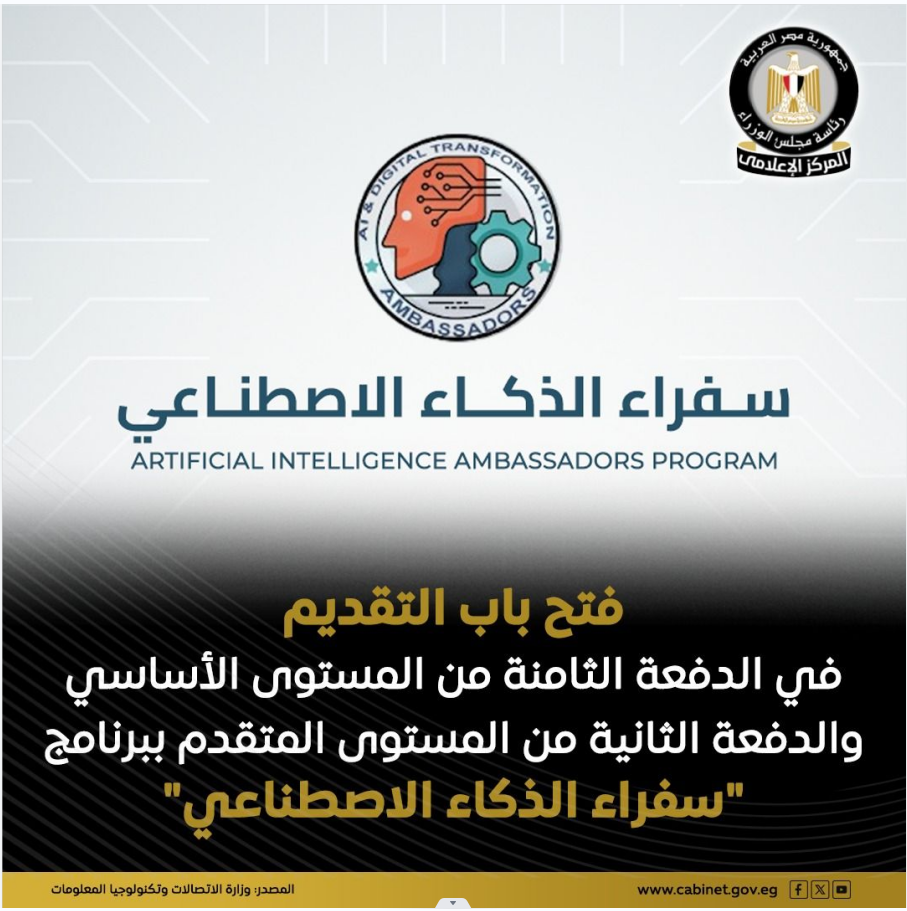 أعلن المعهد القومي للاتصالات، عن فتح باب التقديم في دورة جديدة من برنامج "سفراء الذكاء الاصطناعي"، وتشمل الدفعة الثامنة من المستوى الأساسي والدفعة الثانية من المستوى المتقدم.