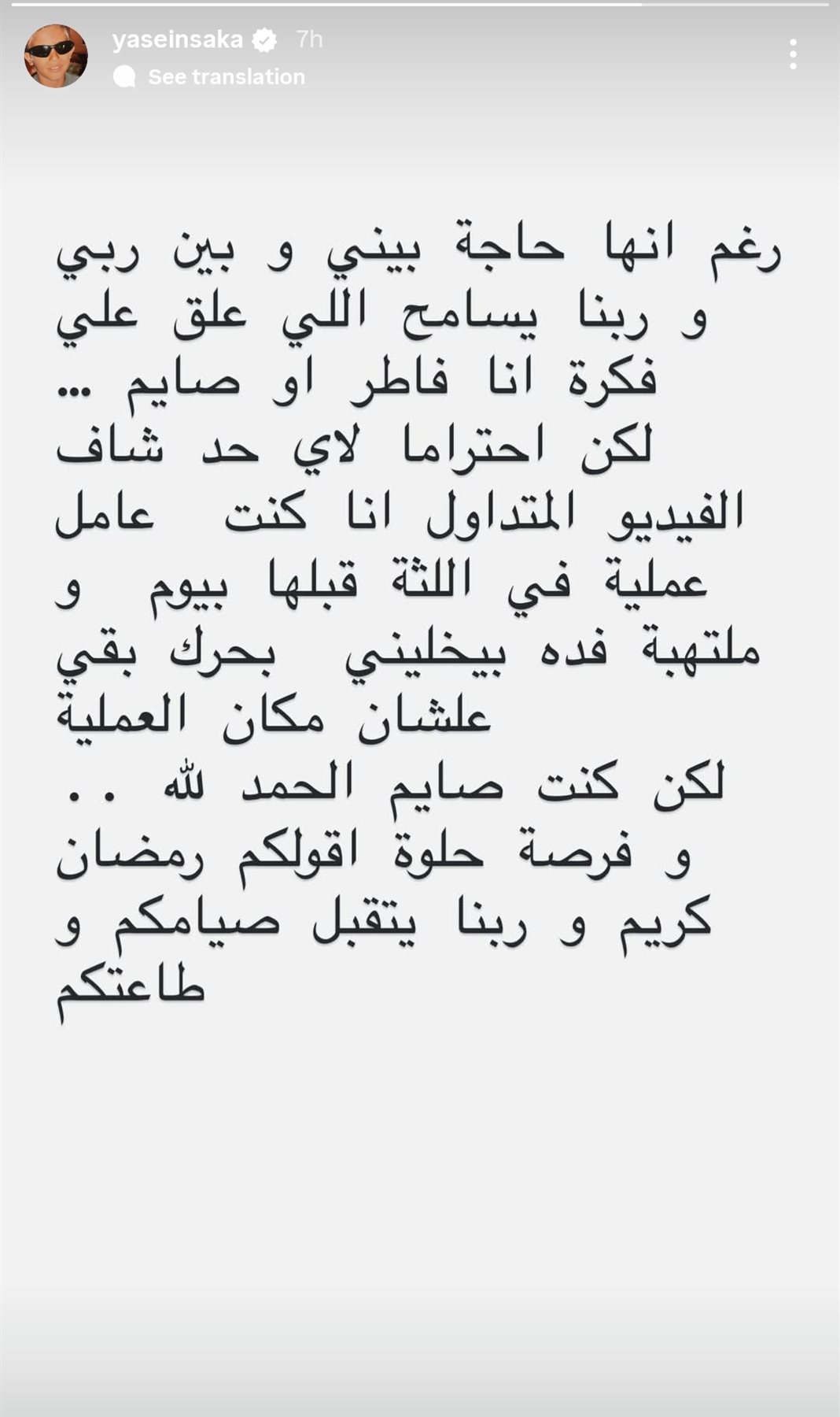 أضاف: لكن كنت صايم الحمد لله.. وفرصة حلوة أقولكم رمضان كريم وربنا يتقبل صيامكم و طاعتكم.