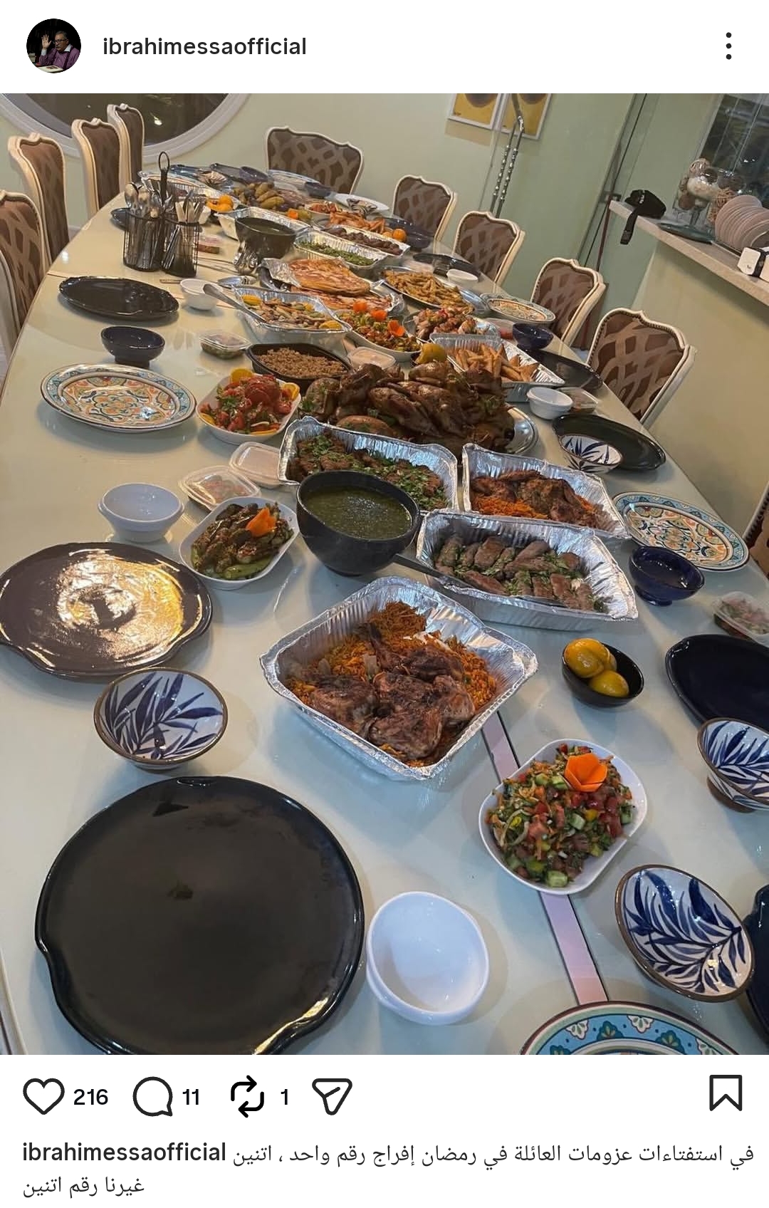 نشر إبراهيم عيسى صورة من إحدى عزومات العائلة خلال شهر رمضان، في إشارة إلى الأجواء الرمضانية المعتادة، وعلق قائلاً: "في استفتاءات عزومات العائلة في رمضان.. إفراج رقم واحد، اتنين غيرنا رقم اتنين"، في تعبير ساخر يشيد خلاله بنجاح المسلسل وحضوره القوي في أحاديث الجمهور خلال الشهر الكريم.