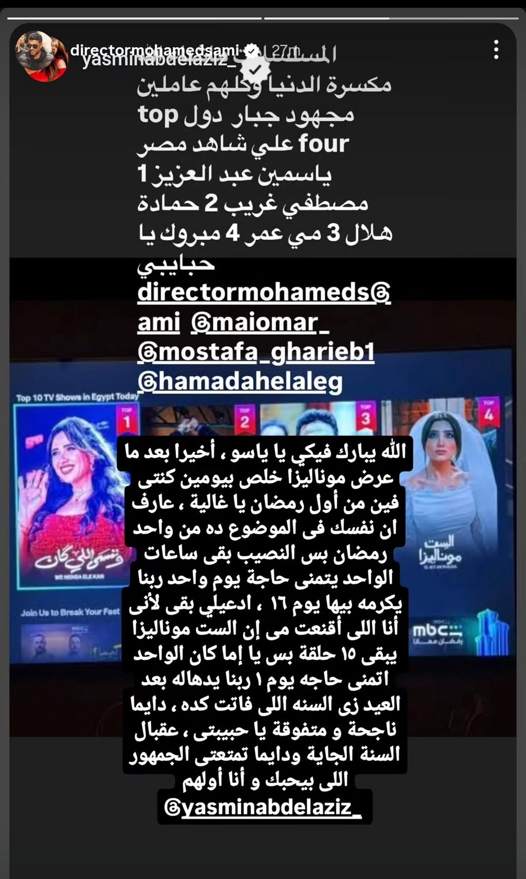 ورد محمد سامي بسخرية، مدافعًا عن مسلسل زوجته الفنانة مي عمر، الذي خاضت به السباق الرمضاني في النصف الأول من رمضان 2026 «الست موناليزا» وكتب: الله يبارك فيكي يا ياسو ، أخيرا بعد ما عرض موناليزا خلص بیومین کنتی فين من أول رمضان يا غالية ، عارف ان نفسك في الموضوع ده من واحد رمضان بس النصيب بقى ساعات الواحد يتمنى حاجة يوم واحد ربنا يكرمه بيها يوم ١٦ ، ادعيلي بقى لأنى أنا اللى أقنعت مي إن الست موناليزا يبقى 15 حلقة بس يا إما كان الواحد اتمنى حاجه يوم 1 ربنا يدهاله بعد العيد زي السنه اللي فاتت كده ، دايما ناجحة و متفوقة يا حبيبتي ، عقبال السنة الجاية ودايما تمتعتى الجمهور اللى بيحبك و أنا أولهم.