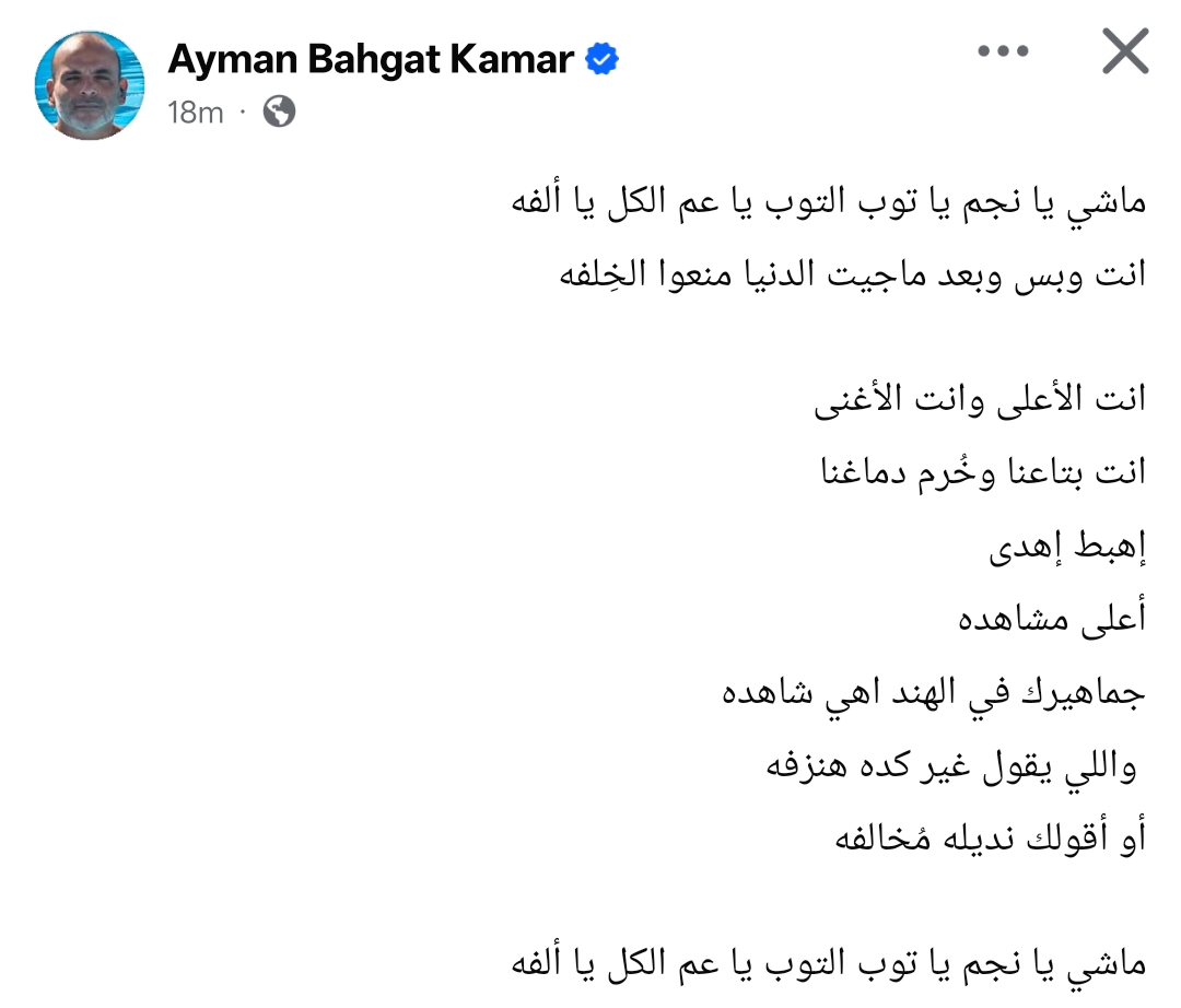 وكتب أيمن بهجت قمر من خلال حسابه الرسمي عبر موقع التواصل الاجتماعي فيسبوك، قال: ماشي يا نجم يا توب التوب يا عم الكل يا ألفه