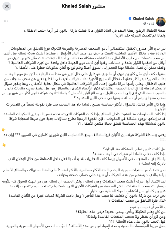 وكتب خالد صلاح منشورًا عبر صفحته الرسمية على فيسبوك قائلًا: «خلال الأشهر الماضية تابعت ما جرى في ملف ألبان الأطفال، فعندما أعلنت شركة نستله قبل أشهر عن سحب دفعات من حليب الأطفال بعد اكتشاف مشكلة محتملة في أحد المكونات، كنت مثل كثيرين غيري من أوائل من انتقدوا القرار بشدة و تساءلت وقتها أين كانت فرق الجودة داخل واحدة من كبرى الشركات العالمية؟ وكيف يمكن أن تصل مشكلة بهذا الحجم إلى السوق أصلاً ويتم توزيع ألبان بمكونات خطرة على الأطفال؟.
