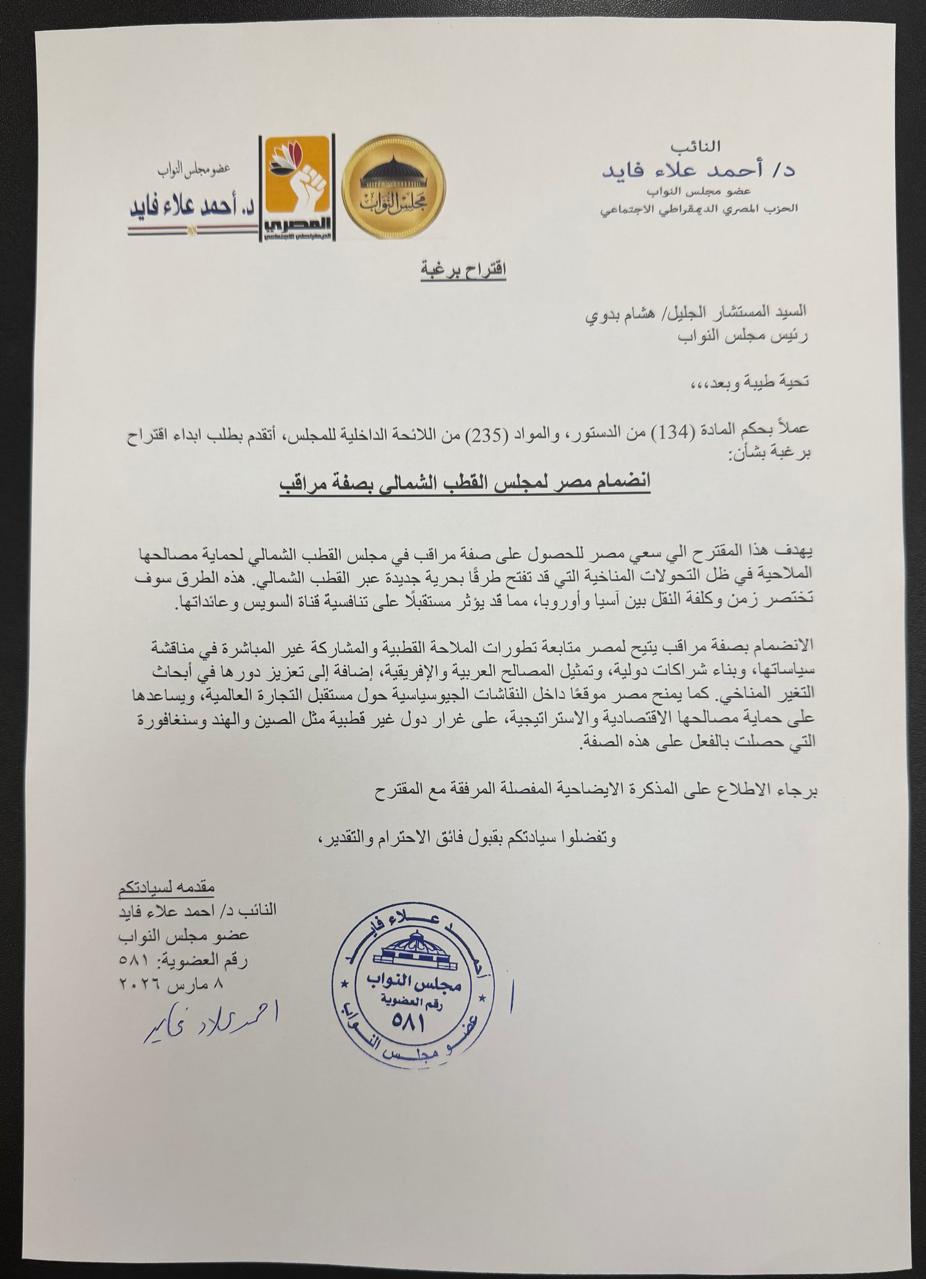 تقدّم النائب أحمد علاء فايد، عضو مجلس النواب عن الحزب المصري الديمقراطي الاجتماعي، باقتراح برغبة المستشار هشام بدوي، رئيس مجلس النواب، بشأن : انضمام مصر لمجلس القطب الشمالي بصفة مراقب.