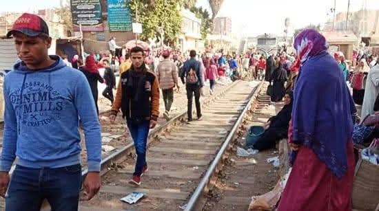 ورصد عدد من المواطنين قيام الباعة بتحويل شريط السكة الحديد إلى سوق عشوائي لبيع الخضروات والفاكهة والسلع المختلفة، رغم ما يمثله ذلك من تهديد مباشر لحياة الباعة والمترددين على السوق، خاصة مع احتمالية مرور القطارات في أي وقت.