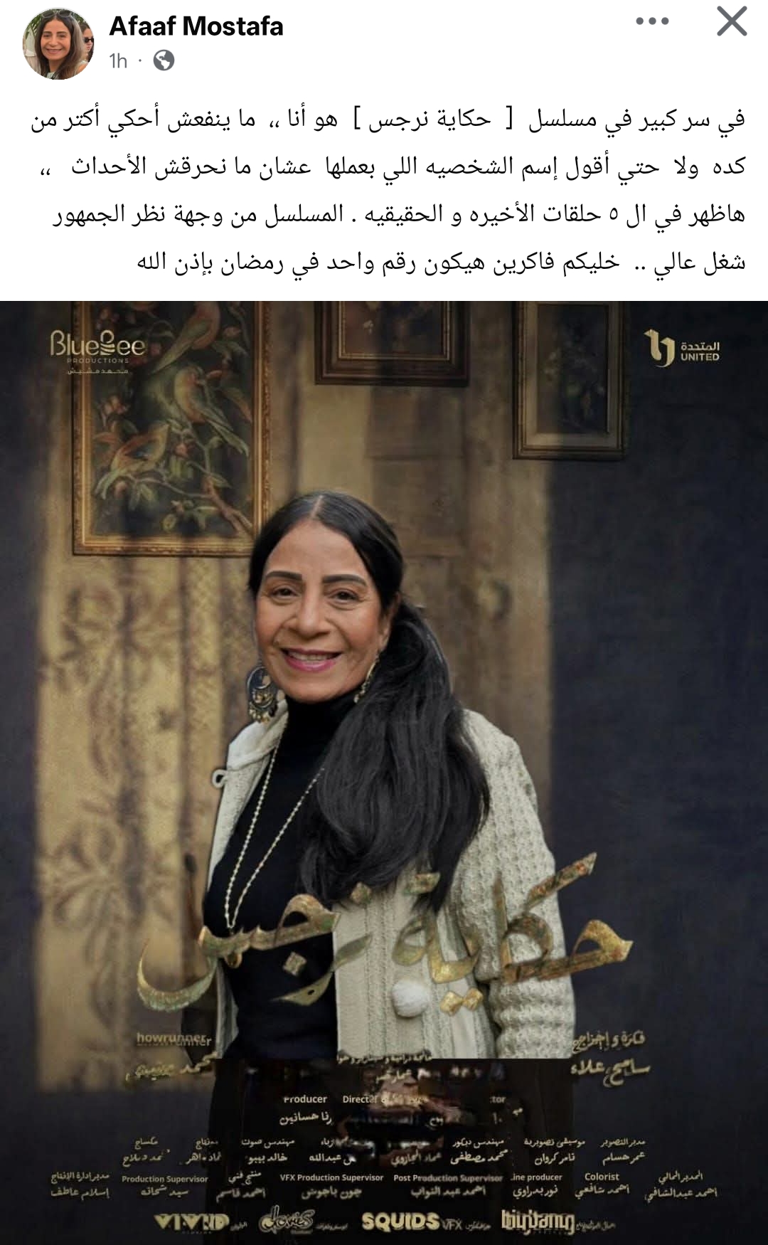 شوقت الفنانة عفاف مصطفى جمهورها لدورها في مسلسل حكاية نرجس بطولة الفنانة ريهام عبد الغفور، الذي يُعرض حاليًا ضمن مسلسلات النصف الثاني من رمضان 2026.