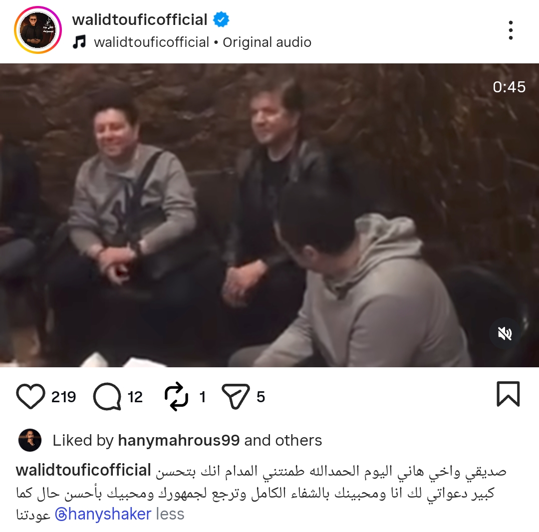 ونُقل هاني شاكر إلى العناية المركزة بعد استئصال جزء من القاولون، وحرص الفنان وليد توفيق على طمأنة جمهوره، حيث كتب من خلال حسابه الرسمي عبر موقع تبادل الصور والفيديوهات القصيرة إنستجرام، قال: صديقي وأخي هاني اليوم الحمد لله طمنتني المدام أنك بتحسن كبير، دعواتي لك أنا ومحبينك بالشفاء الكامل وترجع لجمهورك ومحبيك بأحسن حال كما عودتنا.
