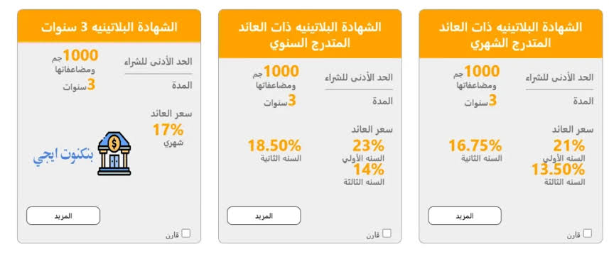 فقد طرح البنك المصري الخليجي (EG Bank) شهادة ادخار ثلاثية باسم “البريميم” بعائد سنوي يصل إلى 17.25% يتم صرفه شهريًا لمدة ثلاث سنوات، مع حد أدنى للاكتتاب يبدأ من 1000 جنيه، ما يجعلها مناسبة لشريحة كبيرة من العملاء الباحثين عن دخل شهري ثابت.