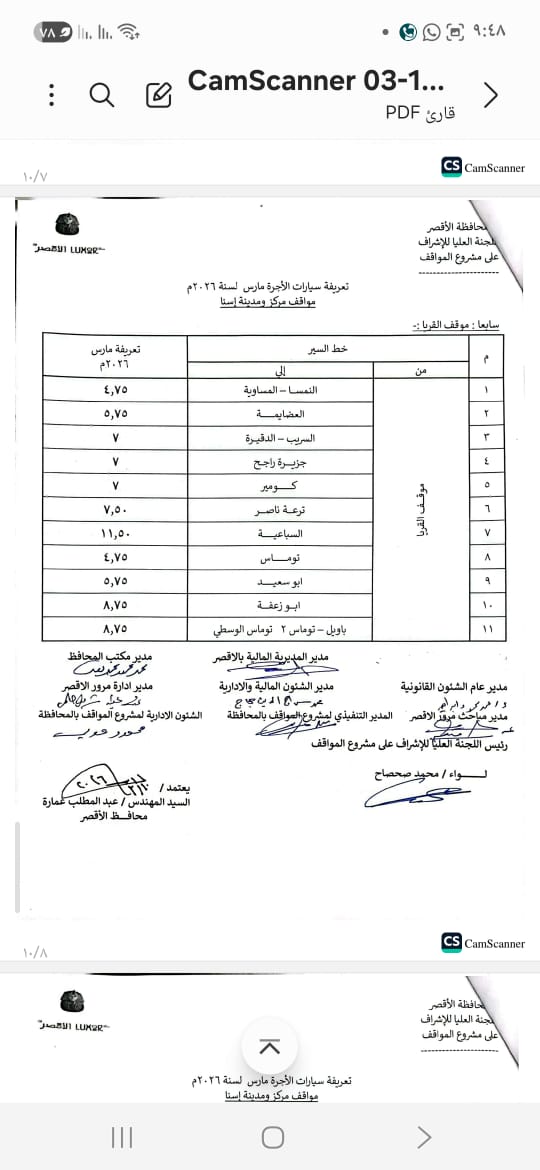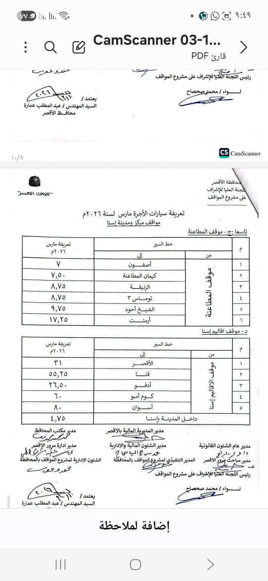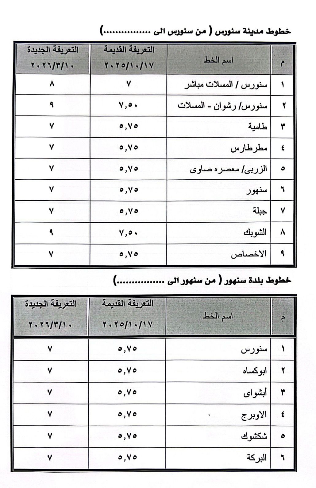 ووجه محافظ الفيوم مدير عام المواقف بالإعلان عن التعريفة الجديدة في مكان واضح بجميع مواقف السيارات داخل المحافظة من خلال وضع لافتات موضح بها خطوط السير وقيمة الأجرة المقررة لكل خط.
