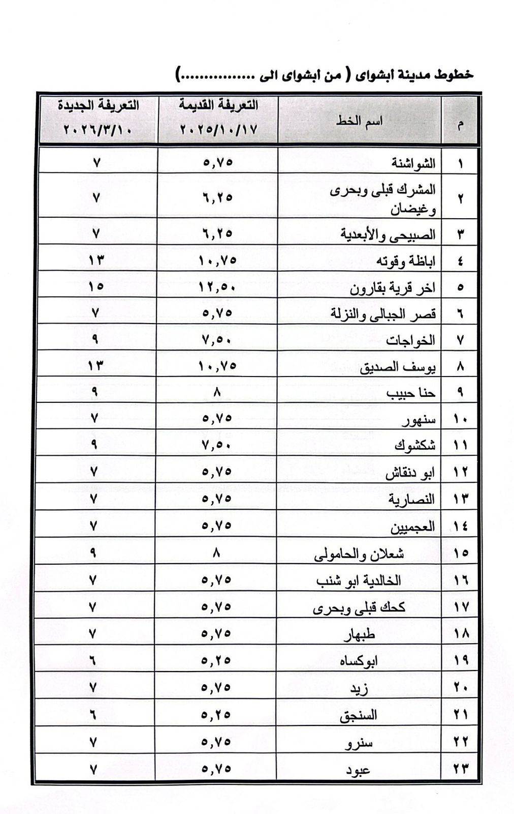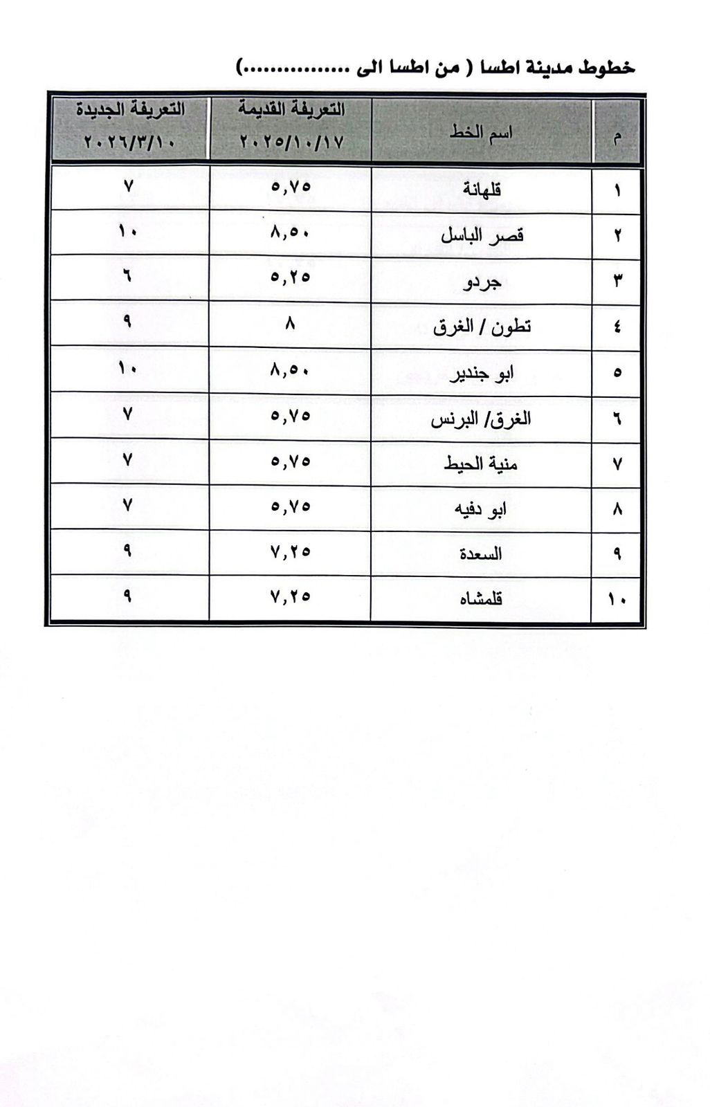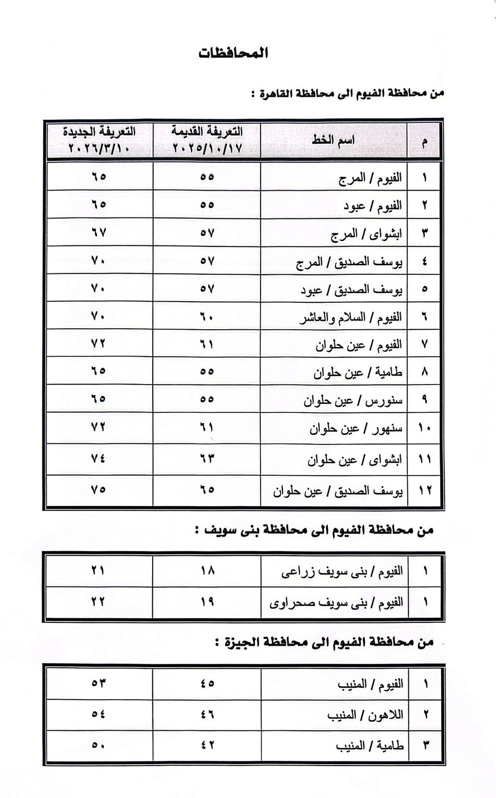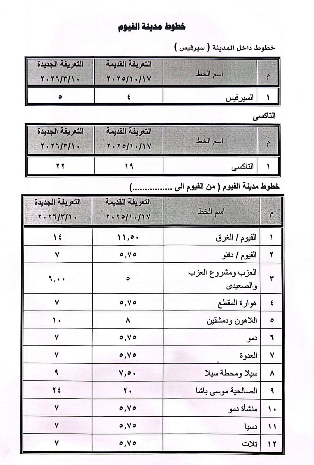 أعلنت محافظة الفيوم تعريفة الركوب الجديدة لخطوط سير سيارات السرفيس والتاكسي وسيارات الأجرة العاملة على الخطوط الداخلية والخارجية بين مراكز المحافظة والمحافظات الأخرى وذلك عقب إعلان لجنة التسعير التلقائي للمنتجات البترولية تحريك أسعار البنزين والسولار بدءا من صباح اليوم الثلاثاء 10 مارس 2026.