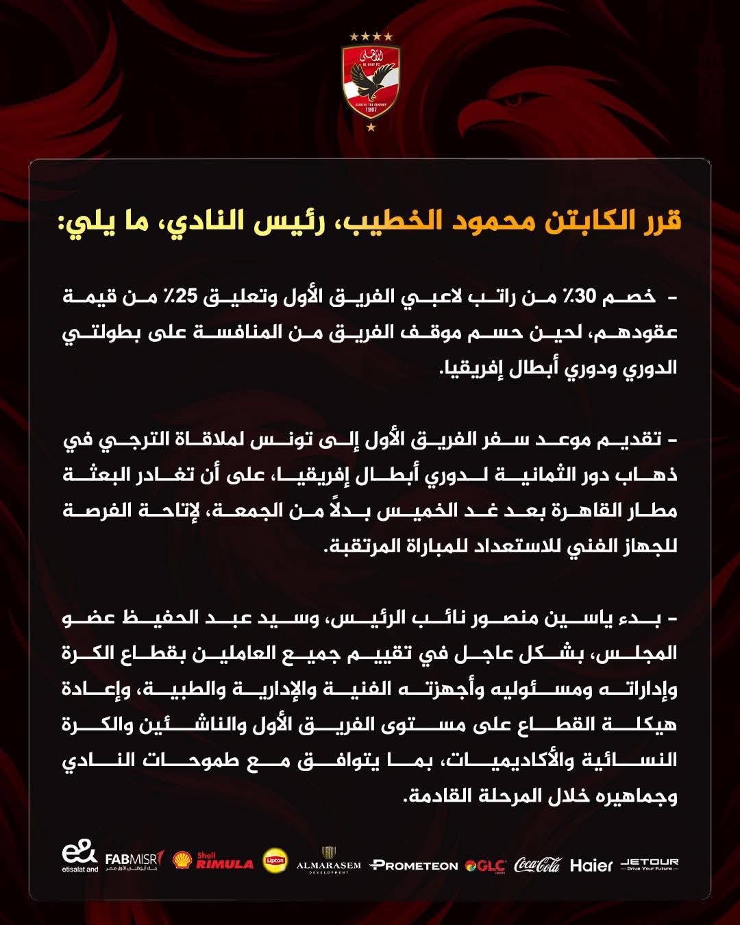 - خصم ٣٠% من راتب لاعبي الفريق الأول وتعليق ٢٥% من قيمة عقودهم، لحين حسم موقف الفريق من المنافسة على بطولتي الدوري ودوري أبطال إفريقيا.