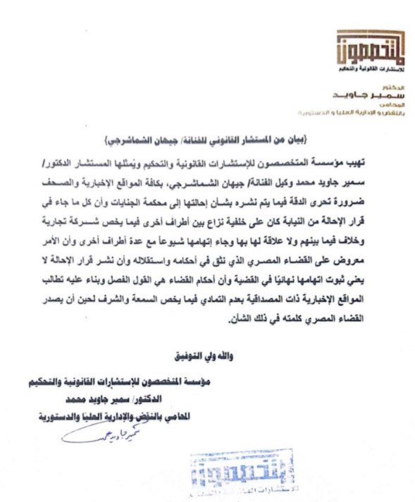 أصدر المستشار القانوني لـ الفنانة جيهان الشماشرجي بيانا رسميا يُطالب فيه وسائل الإعلام بتحري الدقة بشأن ما يُنشر عن إحالة الفنانة للمحاكمة.