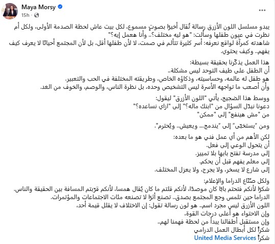 ولفتت إلى أن العمل الدرامي يطرح رسالة إنسانية مهمة، قائلة: "ووسط هذا الضجيج، يأتي "اللون الأزرق" ليقول: دعونا نبدل السؤال من "ابنك ماله؟" إلى "ازاي نساعده؟".. من "مش هينفع" إلى "ممكن".. ومن يستخبى إلى يندمج… ويعيش.. ويُحترم".