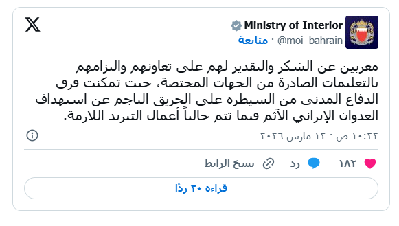 وكتبت في تدوينة عبر صفحتها الرسمية بمنصة «إكس»: «تطمئن وزارة الداخلية المواطنين والمقيمين القاطنين في المناطق المحيطة بموقع استهداف خزانات الوقود بمحافظة المحرق، بأنه يمكنهم ممارسة حياتهم بشكل طبيعي وفتح النوافذ بالمنازل».