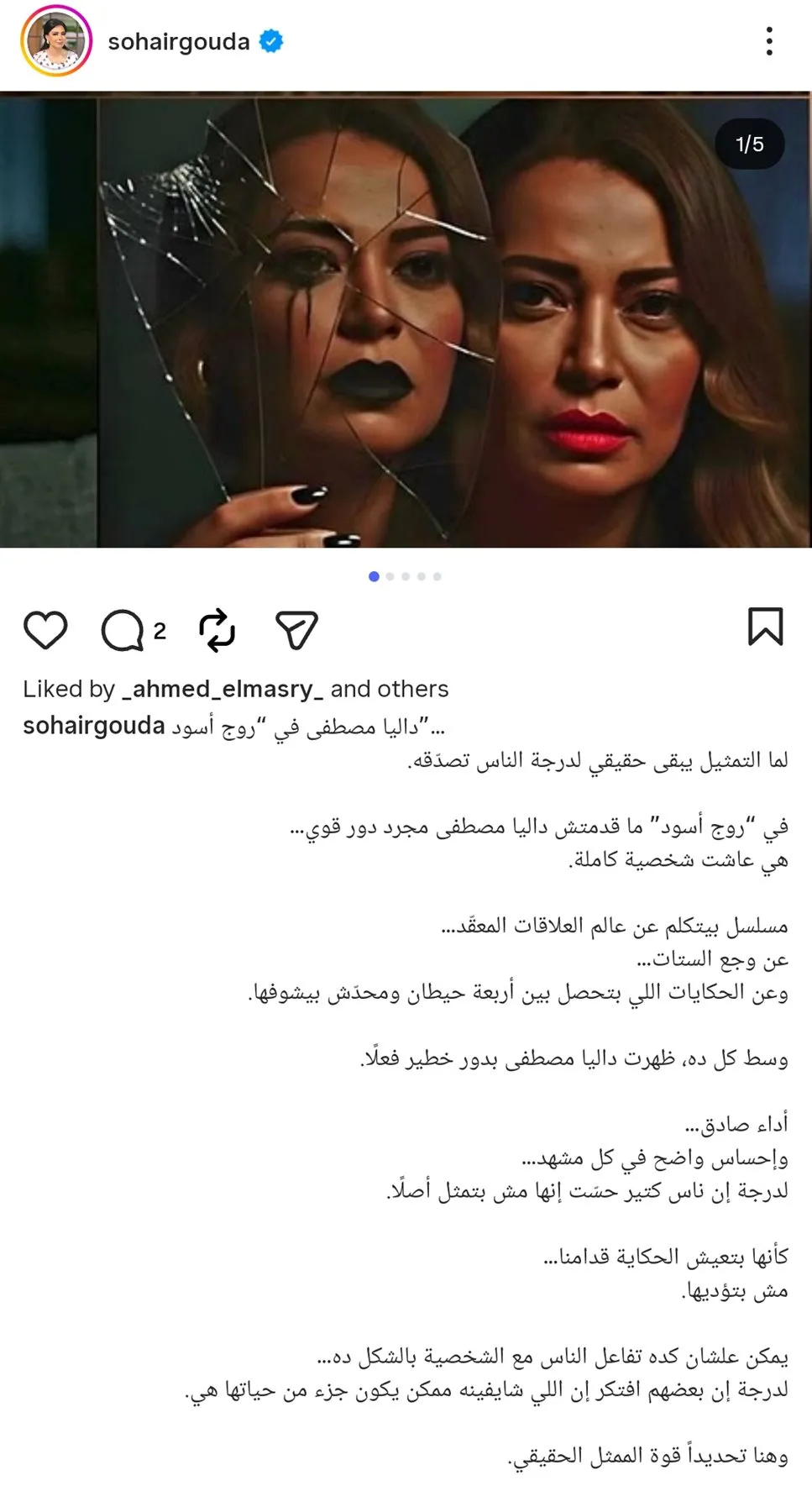 وكتبت سهير جودة من خلال حسابها الرسمي عبر موقع تبادل الصور والفيديوهات القصيرة إنستجرام، قالت: داليا مصطفى في روج أسود.. لما التمثيل يبقى حقيقي لدرجة الناس تصدقه، في "روج أسود" ما قدمتش داليا مصطفى مجرد دور قوي.. هي عاشت شخصية كاملة.