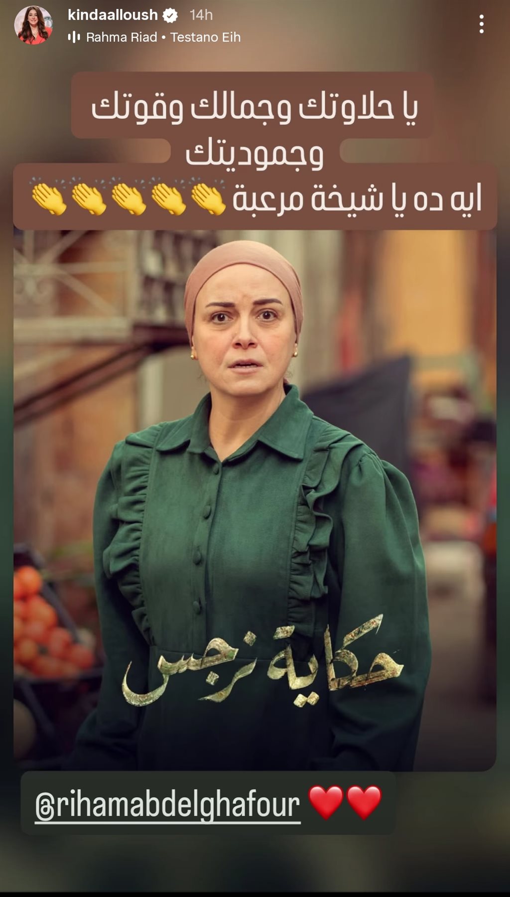 أشادت الفنانة كندة علوش بأداء النجمة ريهام عبد الغفور في مسلسلها الجديد حكاية نرجس، الذي استطاع أن يُحقق جماهيرية عالية منذ عرضه في النصف الثاني من شهر رمضان المبارك.