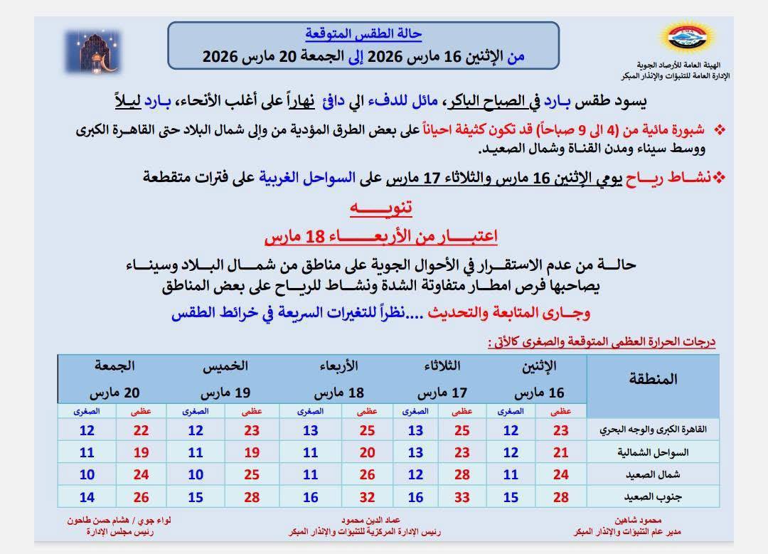 وأكدت الهيئة أن متابعة التحديثات الجوية ستظل مستمرة، نظرًا للتغيرات السريعة في خرائط الطقس خلال هذه الفترة، وهو ما قد يؤدي إلى تحديث التوقعات بشكل مستمر.