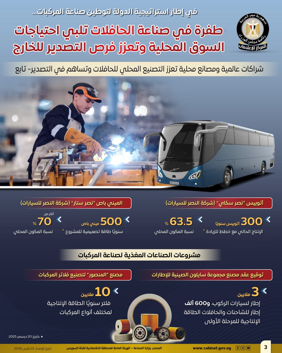 نشر المركز الإعلامي لمجلس الوزراء عددًا من الإنفوجرافات عبر منصاته الرسمية على مواقع التواصل الاجتماعي، سلطت الضوء على ما شهدته صناعة الحافلات من طفرة أسهمت في تلبية احتياجات السوق المحلي، والانطلاق بقوة نحو التصدير، وذلك في إطار استراتيجية الدولة لتوطين صناعة المركبات وتعميق التصنيع المحلي.