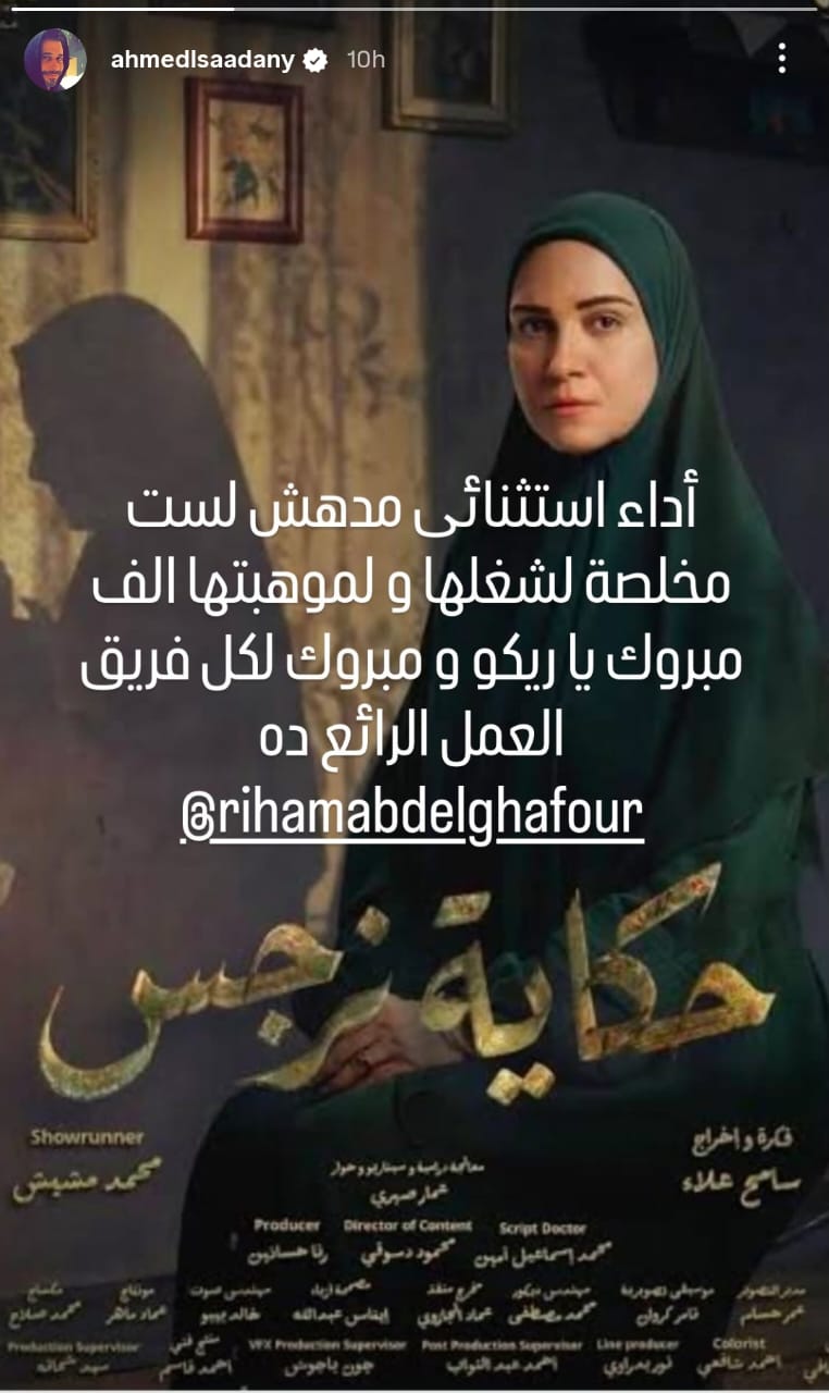 وكتب أحمد السعدني من خلال حسابه الرسمي عبر موقع تبادل الصور والفيديوهات القصيرة إنستجرام، عبر خاصية ستوري، قال: أداء استثنائي مدهش لست مخلصة لشغلها ولموهبتها، ألف مبروك يا ريكور ومبروك لكل فريق العمل الرائع ده.