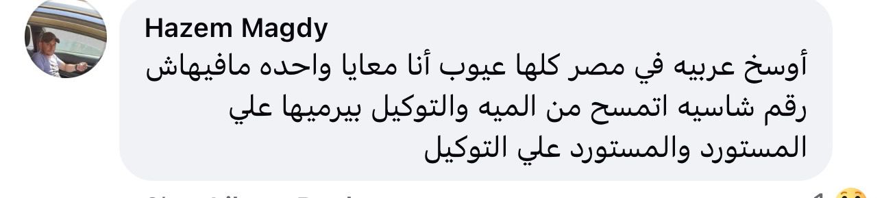 وقال متضرر آخر،: أوسخ عربيه في مصر كلها عيوب أنا معايا واحده مافيهاش رقم شاسيه اتمسح من الميه والتوكيل بيرميها علي المستورد والمستورد علي التوكيل".