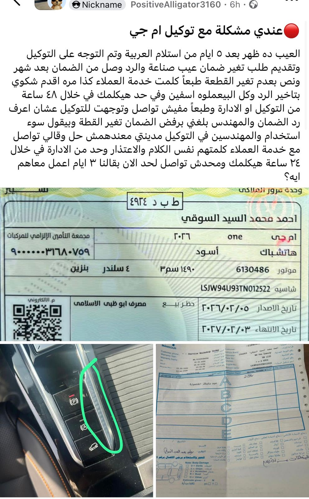 وقال صاحب المشكلة عبر موقع التواصل الاجتماعي : عندي مشكلة مع توكيل ام جي.. العيب ده ظهر بعد 5 ايام من استلام العربية وتم التوجه على التوكيل وتقديم طلب تغير ضمان عيب صناعة والرد وصل من الضمان بعد شهر ونص بعدم تغير القطعة طبعا”.