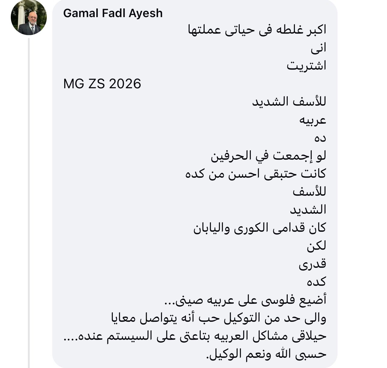 وتفاعل عدد كبير من العملاء مع المشكلة فقال متضرر : اكبر غلطه فى حياتى عملتها انى اشتريت MG ZS 2026 للأسف الشديد عربية ده لو اتجمعت في الحرفين كانت حتبقى احسن من كده للأسف الشديد وإلى حد من التوكيل حب أنه يتواصل معايا حيلاقى مشاكل العربيه بتاعتى على السيستم عنده".