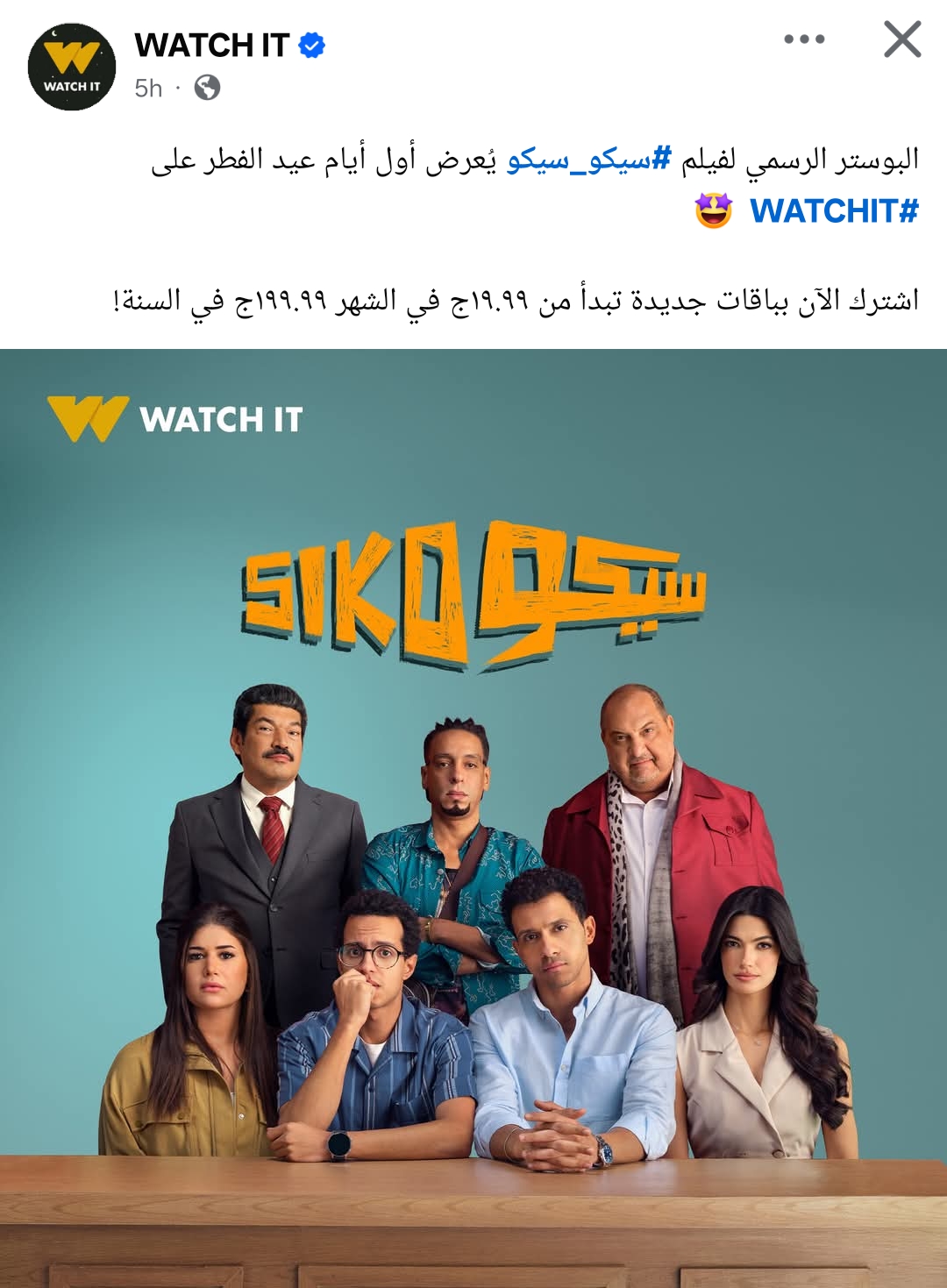 وكتبت Watch it من خلال حسابها الرسمي عبر موقع التواصل الاجتماعي فيسبوك: البوستر الرسمي لفيلم سيكو سيكو يُعرض أول أيام عيد الفطر على Watch it.