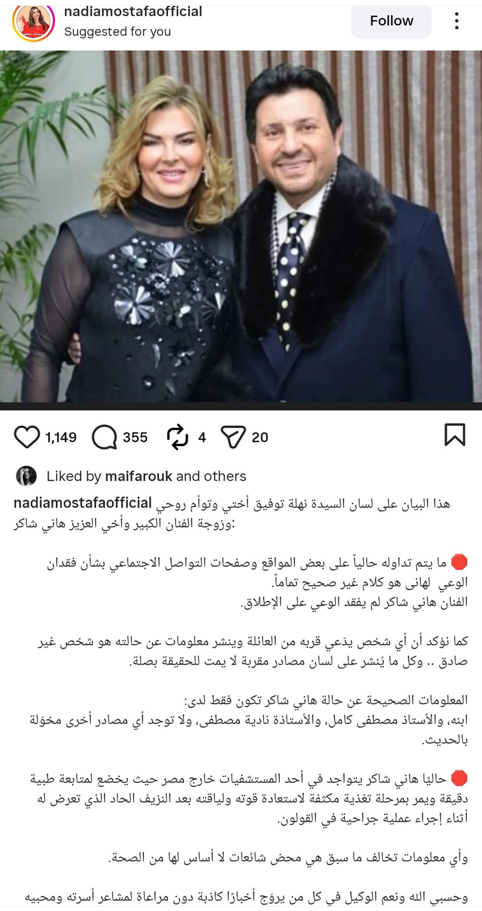 تابعت: المعلومات الصحيحة عن حالة هاني شاكر تكون فقط لدى ابنه، والأستاذ مصطفى كامل، والأستاذة نادية مصطفى، ولا توجد أي مصادر أخرى مخولة بالحديث.