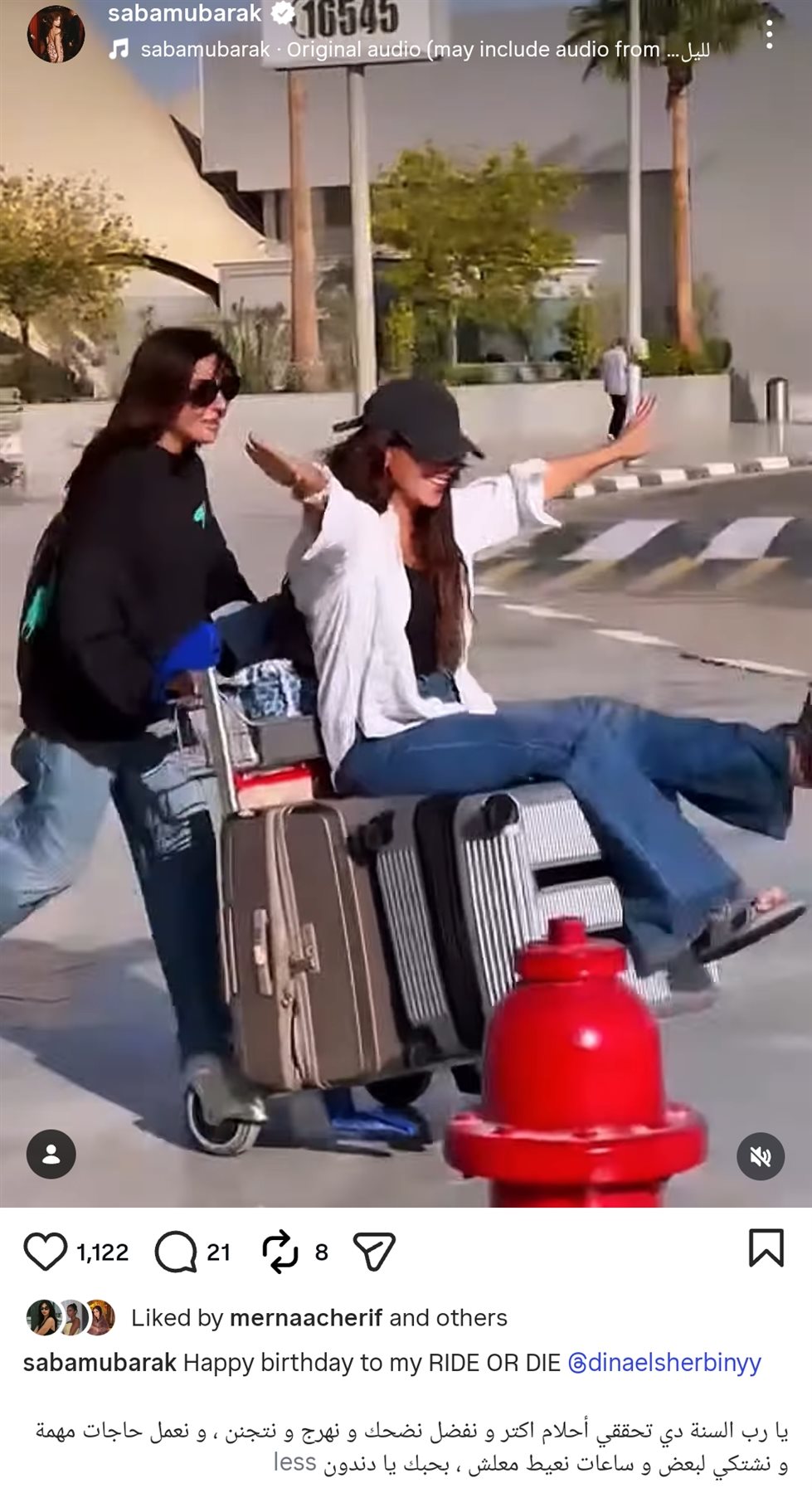 وشاركت صبا مبارك جمهورها مقطع فيديو يجمعها بها، من خلال حسابها الرسمي عبر موقع تبادل الصور والفيديوهات القصيرة إنستجرام، وعلقت: عيد ميلاد سعيد لرفيقة دربي المخلصة.. يا رب السنة دي تحققي أحلام اكثر و نفضل نضحك و نهرج و نتجنن، و نعمل حاجات مهمة و نشتكي لبعض و ساعات نعيط معلش ، بحبك يا دندون.