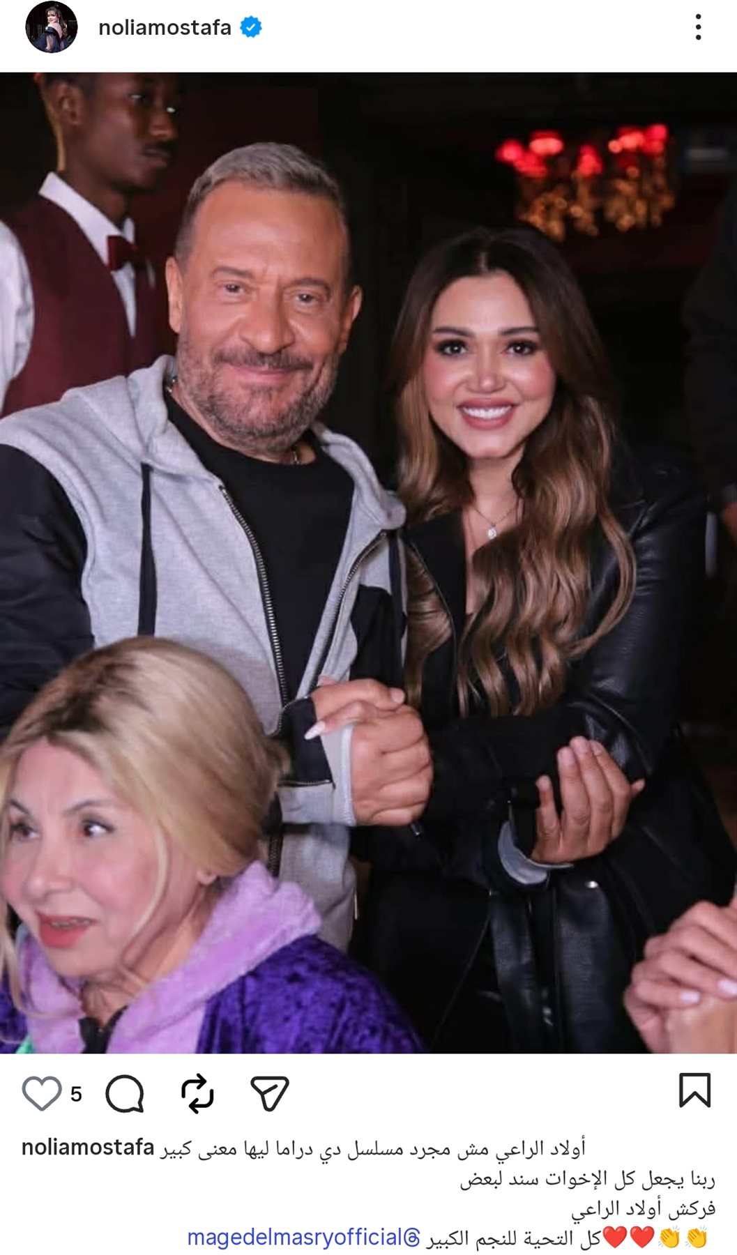 ووجهت نوليا رسالة لـ الفنان ماجد المصري، وكتبت من خلال حسابها الرسمي عبر موقع تبادل الصور والفيديوهات القصيرة إنستجرام، قالت: أولاد الراعي مش مجرد مسلسل دي دراما ليها معنى كبير.. ربنا يجعل كل الاخوات سند لبعض.. فركش أولاد الراعي.. كل التحية لـ النجم الكبير ماجد المصري.
