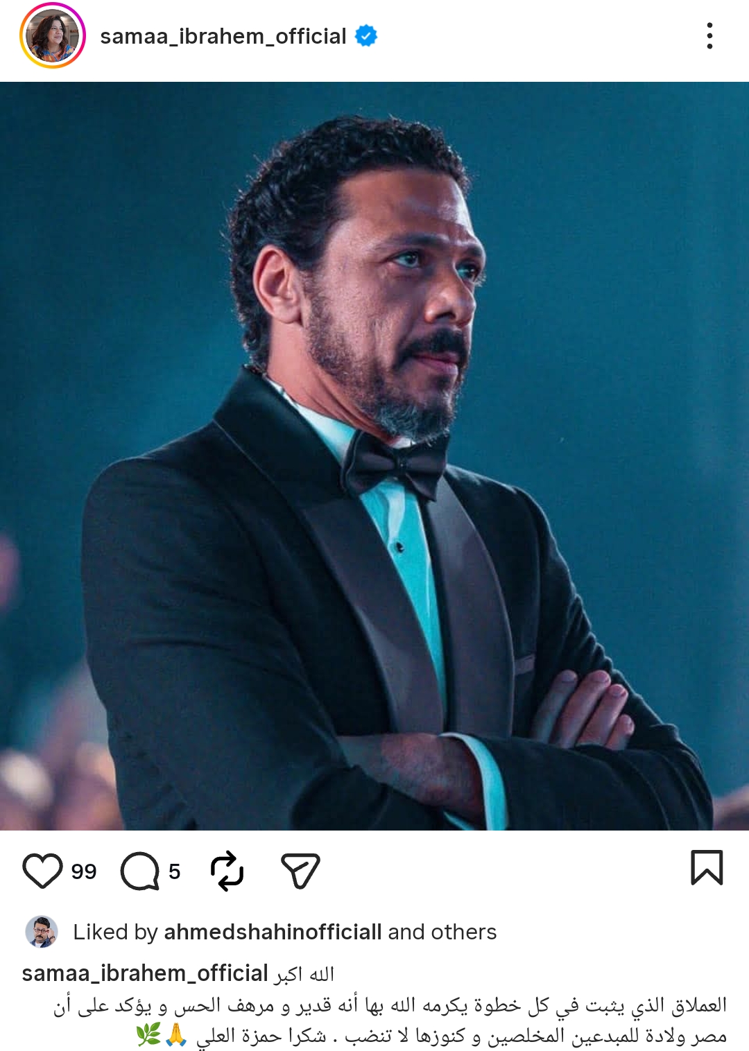 وكتبت سماء إبراهيم من خلال حسابها الرسمي عبر موقع تبادل الصور والفيديوهات القصيرة إنستجرام، قالت: الله اكبر.. العملاق الذي يثبت في كل خطوة يكرمه الله بها أنه قدير و مرهف الحس و يؤكد على أن مصر ولادة للمبدعين المخلصين و كنوزها لا تنضب.. شكرا حمزة العلي.