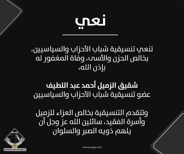 تنعي تنسيقية شباب الأحزاب والسياسيين، بخالص الحزن والأسى وفاة شقيق الزميل أحمد عبد اللطيف عضو التنسيقية.