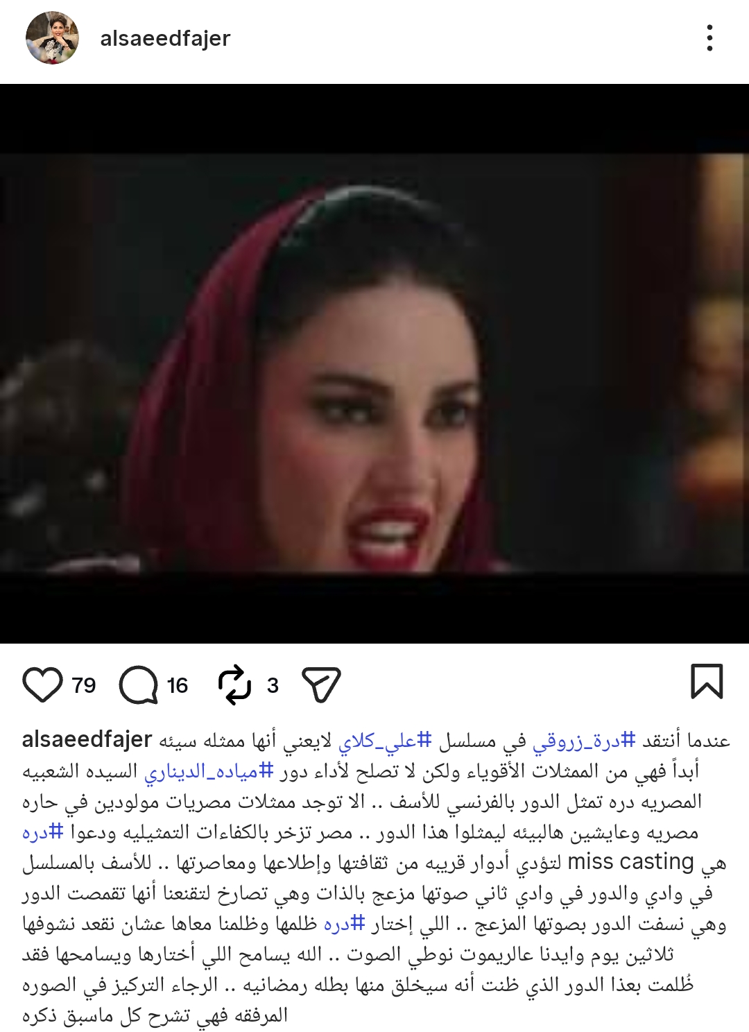 وكتبت فجر السعيد من خلال حسابها الرسمي عبر موقع تبادل الصور والفيديوهات القصيرة إنستجرام، قالت: عندما أنتقد درة في مسلسل علي كلاي لايعني أنها ممثلة سيئة أبداً فهي من الممثلات الأقوياء ولكن لا تصلح لأداء دور ميادة الديناري السيدة الشعبية المصرية.