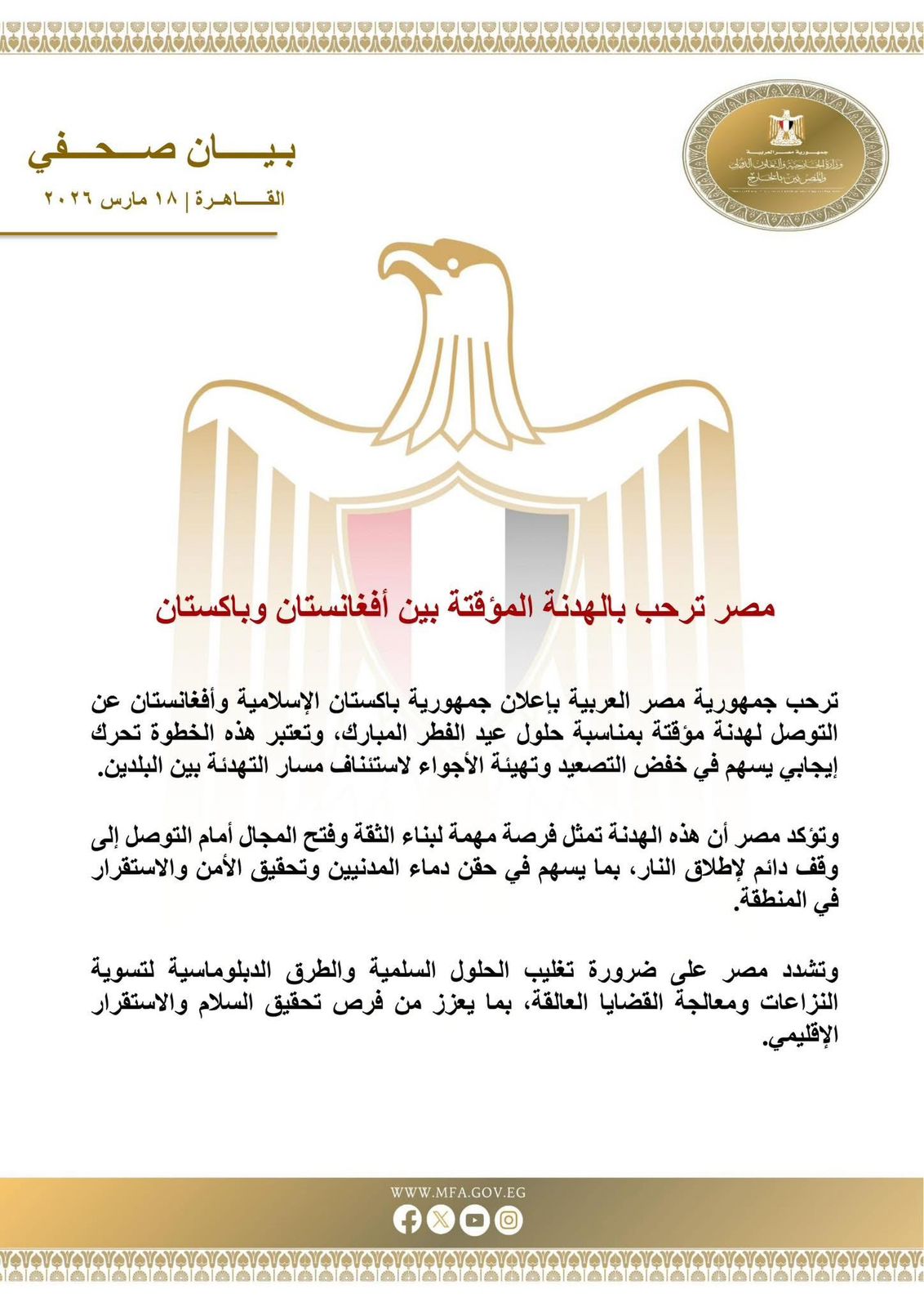 رحبت مصر بإعلان جمهورية باكستان الإسلامية وأفغانستان عن التوصل لهدنة مؤقتة بمناسبة حلول عيد الفطر المبارك، وتعتبر هذه الخطوة تحركا إيجابيا يسهم في خفض التصعيد وتهيئة الأجواء لاستئناف مسار التهدئة بين البلدين.