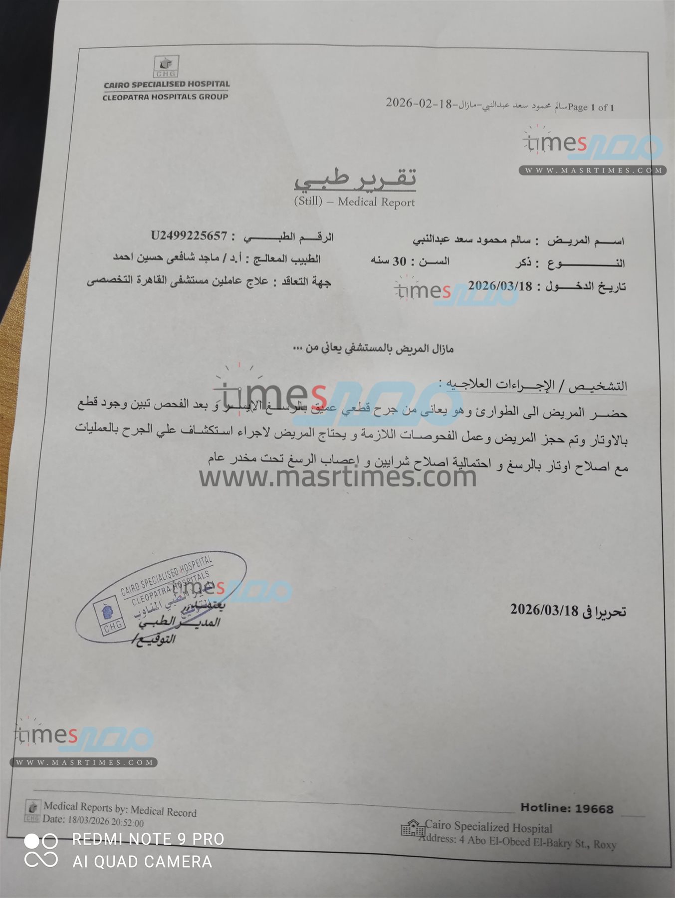 وأكدت أسرة المصاب أن مطالبها تقتصر على توثيق الواقعة بشكل كامل وإثبات جميع الإصابات رسميا، مع اتخاذ الإجراءات القانونية اللازمة حيال المتورطين، خاصة أن الحادث وقع داخل منشأة طبية بما يمثله ذلك من تهديد مباشر لسلامة العاملين بها.