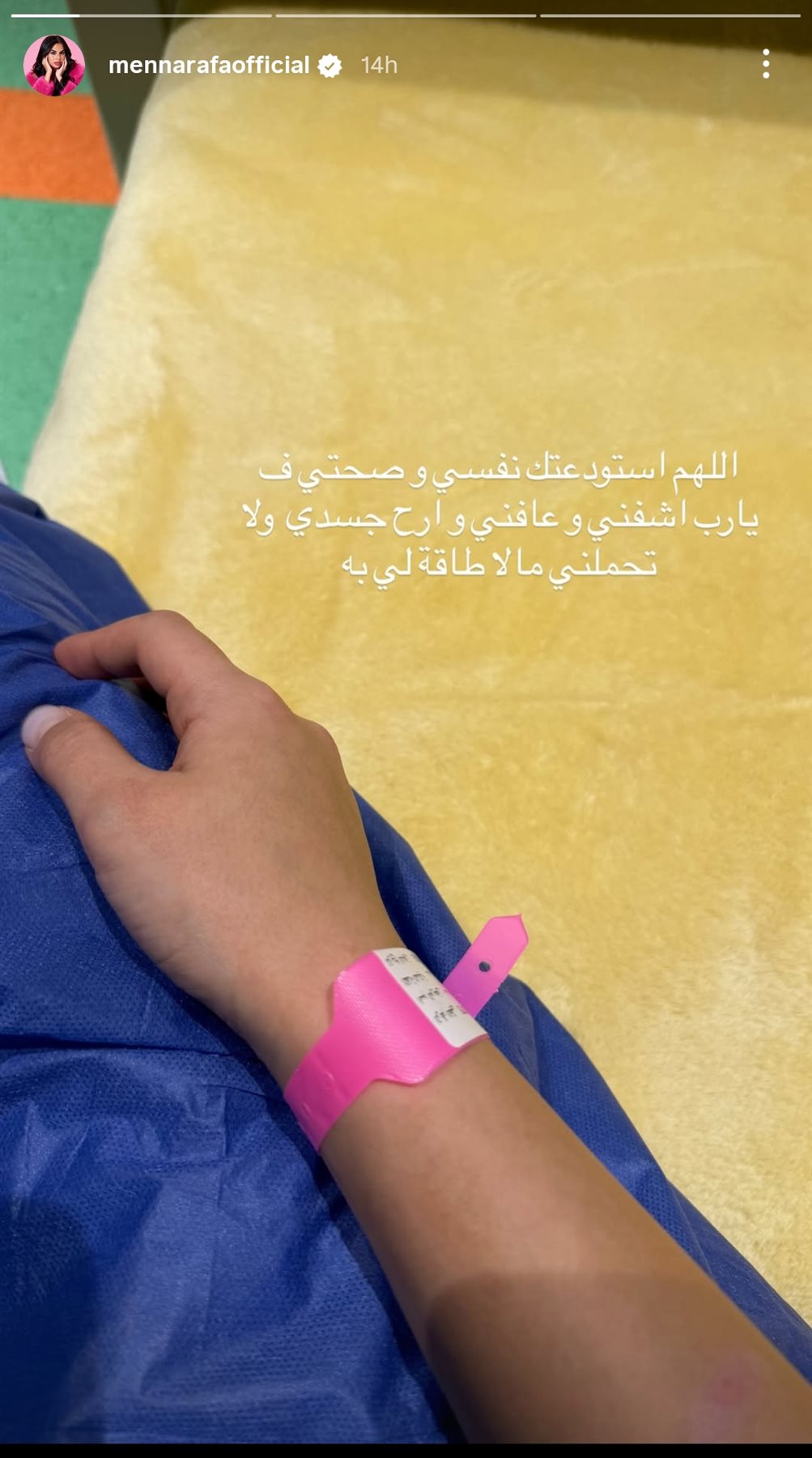 وطالبت منة عرفة من جمهورها الدعاء لها بالشفاء العاجل، وكتبت من خلال حسابها الرسمي عبر موقع تبادل الصور والفيديوهات القصيرة إنستجرام، عبر خاصية ستوري: اللهم استودعتك نفسي وصحتي ف يارب اشفني و عافني و ارح جسدي ولا تحملني ما لا طاقة لي به.