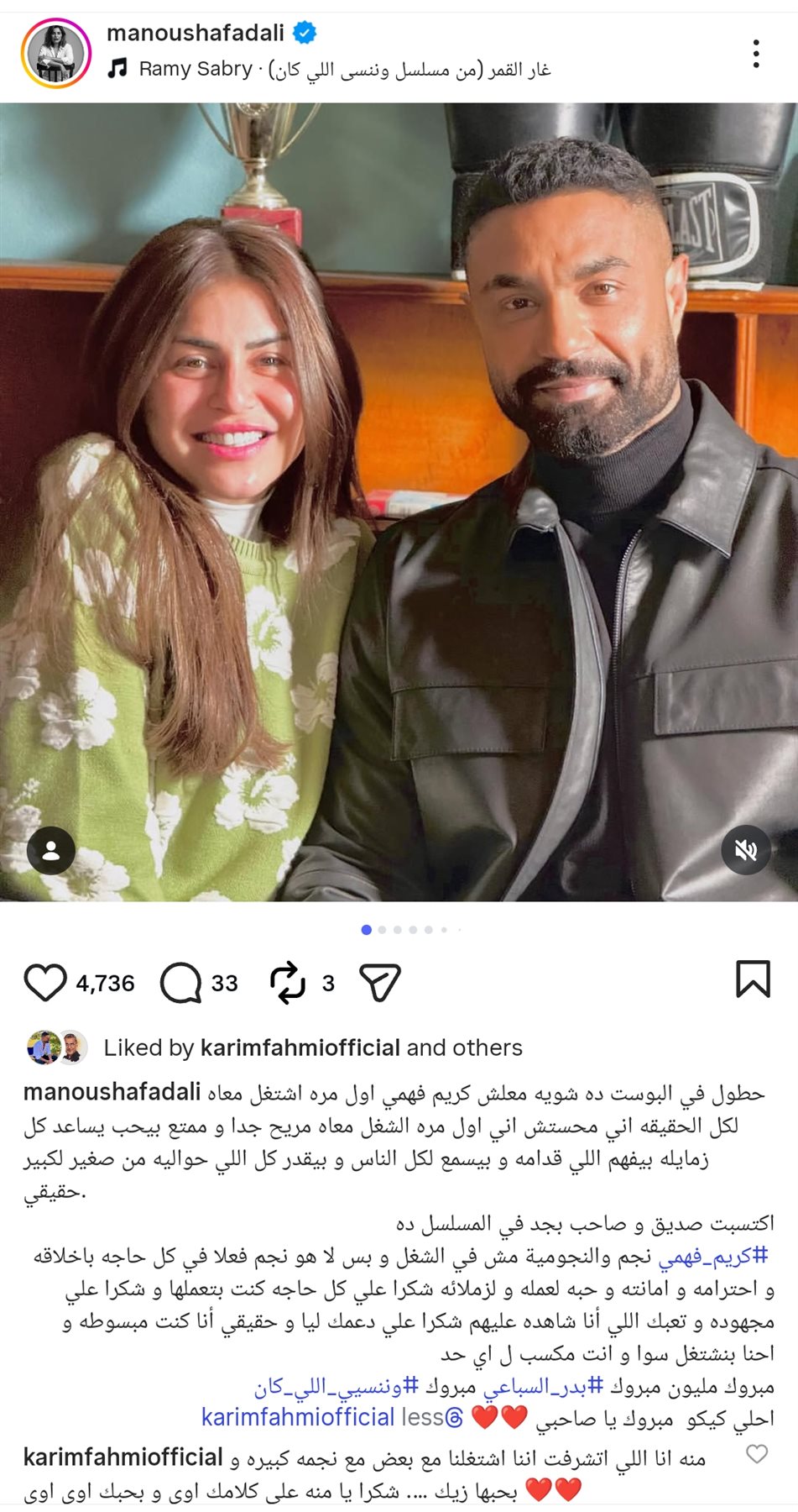 وشاركت منة فضالي جمهورها صورا تجمعهما سويًا من كواليس العمل، وكتبت من خلال حسابها الرسمي عبر موقع تبادل الصور والفيديوهات القصيرة إنستجرام، قالت: حطول في البوست ده شويه معلش كريم فهمي اول مره اشتغل معاه لكل الحقيقه اني محستش اني اول مره الشغل معاه مريح جدا و ممتع بيحب يساعد كل زمايله بيفهم اللي قدامه و بيسمع لكل الناس و بيقدر كل اللي حواليه من صغير لكبير حقيقي.