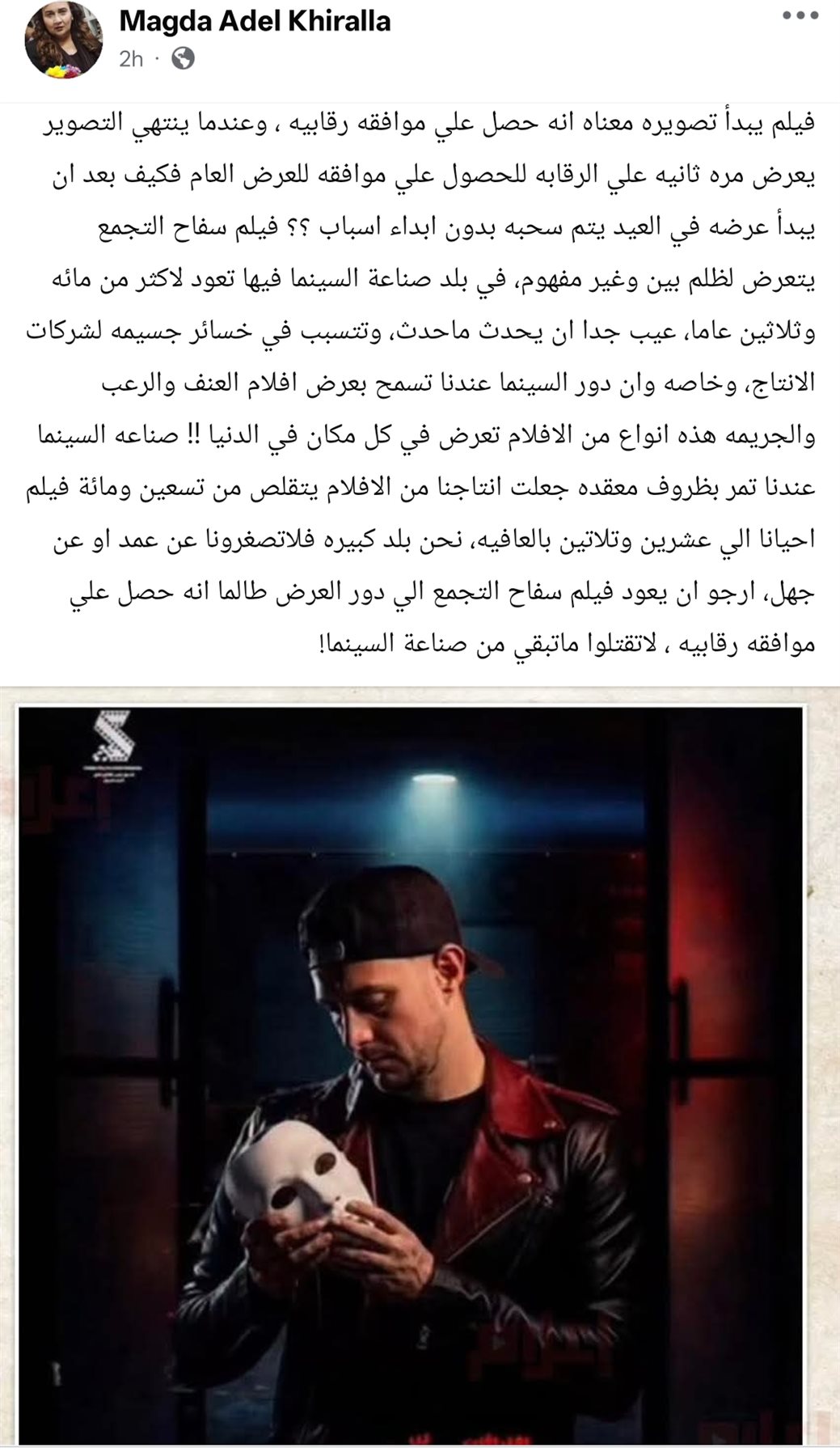 وكتبت ماجدة خير الله من خلال حسابها الرسمي عبر موقع التواصل الاجتماعي فيسبوك، قال: فيلم يبدأ تصويره معناه انه حصل علي موافقه رقابيه ، وعندما ينتهي التصوير يعرض مره ثانيه علي الرقابه للحصول علي موافقه للعرض العام فكيف بعد ان يبدأ عرضه في العيد يتم سحبه بدون ابداء اسباب ؟؟.