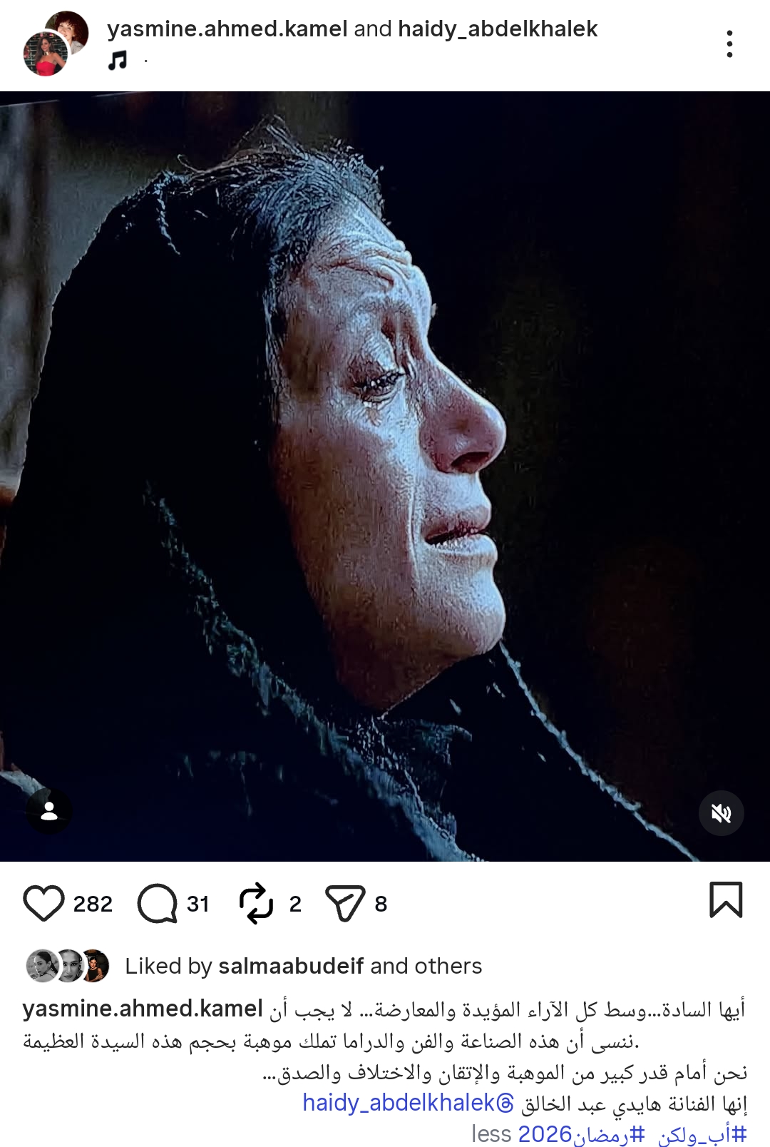 وكتبت ياسمين أحمد كامل من خلال حسابها الرسمي عبر موقع التواصل الاجتماعي فيسبوك، قالت: أيها السادة.. وسط كل الآراء المؤيدة والمعارضة.. لا يجب أن ننسى أن هذه الصناعة والفن والدراما تملك موهبة بحجم هذه السيدة العظيمة نحن أمام قدر كبير من الموهبة والإتقان والاختلاف والصدق إنها الفنانة هايدي عبد الخالق.