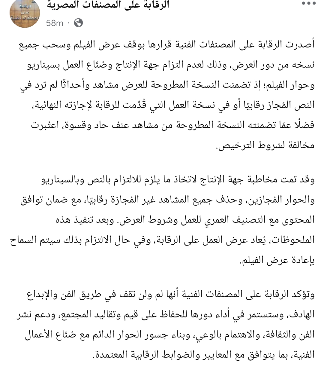 وقد تمت مخاطبة جهة الإنتاج لاتخاذ ما يلزم للالتزام بالنص وبالسيناريو والحوار المُجازين، وحذف جميع المشاهد غير المُجازة رقابيًا، مع ضمان توافق المحتوى مع التصنيف العمري للعمل وشروط العرض. وبعد تنفيذ هذه الملحوظات، يُعاد عرض العمل على الرقابة، وفي حال الالتزام بذلك سيتم السماح بإعادة عرض الفيلم.