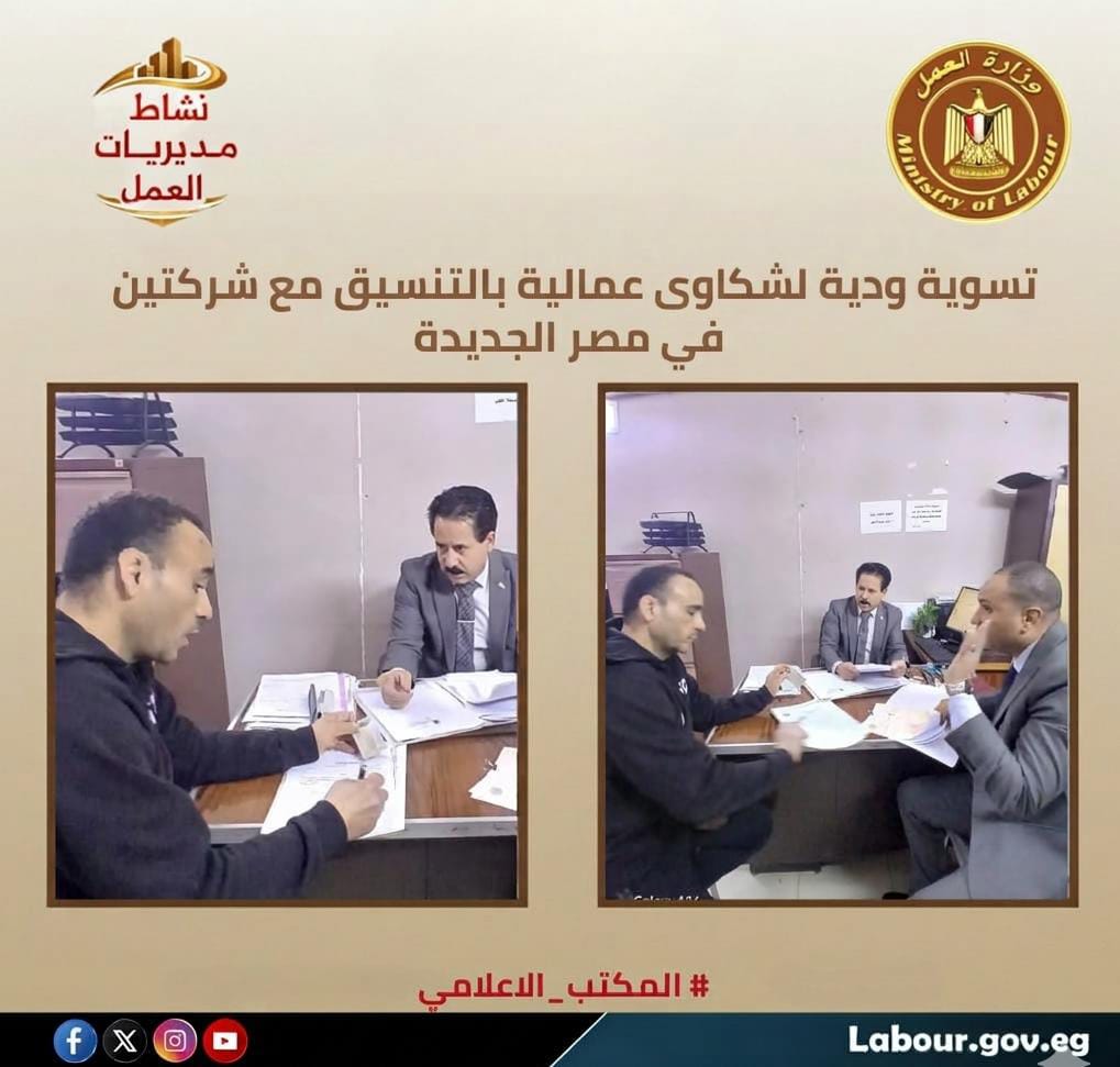 أعلنت مديرية عمل القاهرة، بإشراف سيد الشرقاوي مدير المديرية و إسلام أحمد وكيل المديرية، عن نجاح مكتب عمل شرق مدينة نصر ومصر الجديدة في إتمام تسوية ودية لشكاوى عمالية دون اللجوء للقضاء. شملت التسوية صرف المستحقات المالية، ورصيد الإجازات، وتسليم شهادات الخبرة ومسوغات التعيين لعاملين ، وذلك تنفيذاً لتوجيهات الوزير حسن الرداد بتعزيز الحلول السلمية للنزاعات وضمان حقوق طرفي العملية الإنتاجية بـمحافظة القاهرة