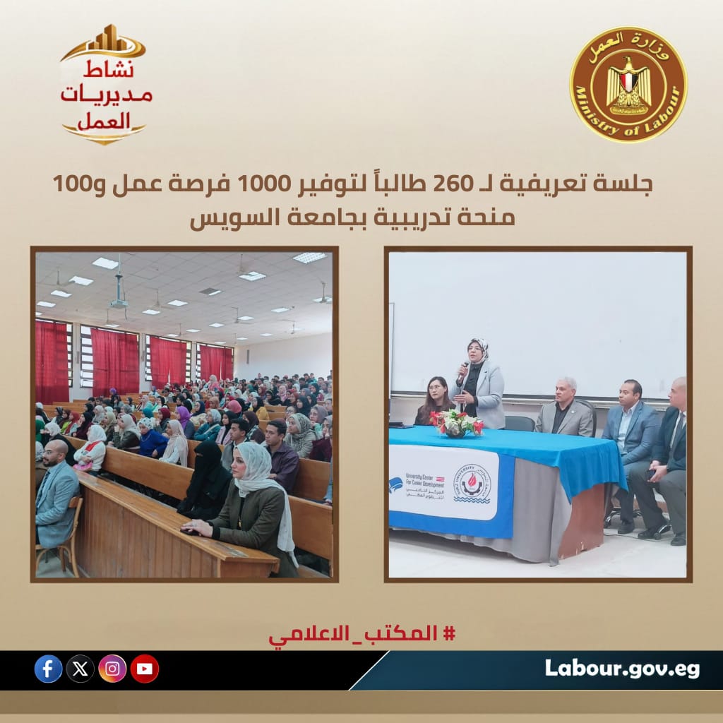 تحت رعاية الوزير حسن الرداد والمحافظ اللواء هاني رشاد ورئيس الجامعة أشرف حنيجل؛ نظمت مديرية عمل السويس، بقيادة لمياء محمود، جلسة تعريفية لطلاب وخريجي كليات الهندسة والتجارة والآداب لربط التعليم بسوق العمل. استعرضت شركتا "تيدا مصر" و"أجيليتي" بالمنطقة الاقتصادية فيديوهات توضيحية عن أنشطتهما، مع الإعلان عن 1000 فرصة عمل و100 فرصة تدريب تخصصي (هندسة، ترجمة صينية، IT، موارد بشرية)، وسط تفاعل كبير للإجابة على استفسارات الشباب وتأهيلهم للالتحاق بالوظائف المتاحة بـمحافظة السويس