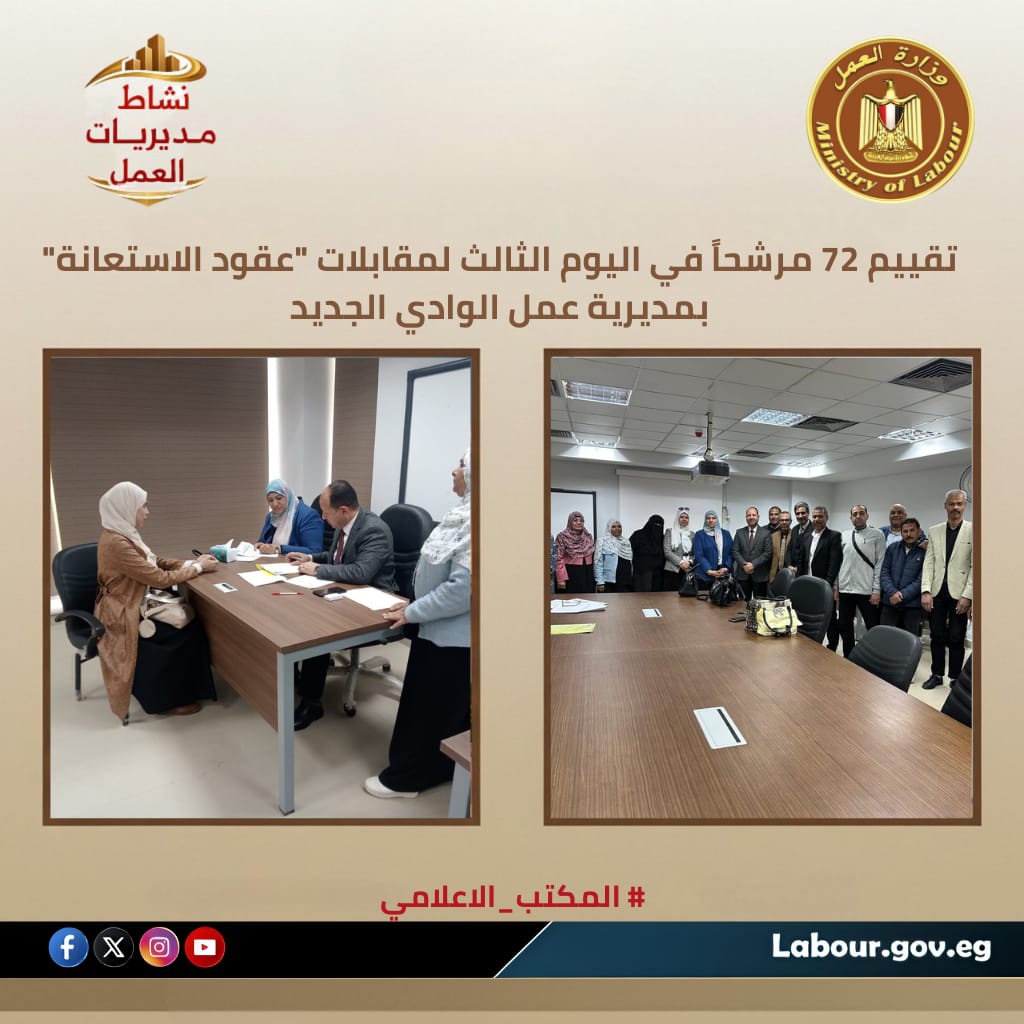 استكمالاً لأعمال اللجنة المشكلة وبتوجيهات الوزير حسن الرداد؛ واصلت مديرية عمل الوادي الجديد لليوم الثالث على التوالي إجراء المقابلات الشخصية للمتقدمين بنظام عقود الاستعانة. استقبلت اللجنة 72 متقدماً للتقييم وفق معايير الشفافية والنزاهة المطلقة، لضمان اختيار كفاءات قادرة على تحمل المسؤولية وتعزيز أداء الجهاز الإداري وتكافؤ الفرص بين أبناء محافظة الوادي الجديد