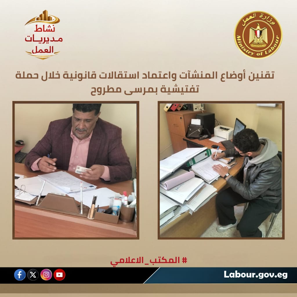 واصل مكتب عمل مطروح، اليوم الأربعاء، حملاته الرقابية الميدانية لضمان إنفاذ أحكام قانون العمل الجديد رقم 14 لسنة 2025؛ حيث شملت الأعمال التفتيش على عدد من المنشآت بمرسى مطروح، واستلام مستندات تسوية الملاحظات للمنشآت التي مُنحت مهلة قانونية سابقاً. كما شهد المكتب اعتماد عدد من الاستقالات الرسمية لضمان صون حقوق العمال وطرفي العملية الإنتاجية، وذلك بإشراف مدير المديرية وإدارة الرعاية بمدينة مرسى مطروح